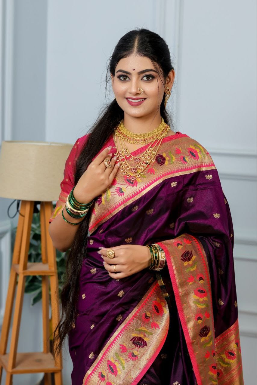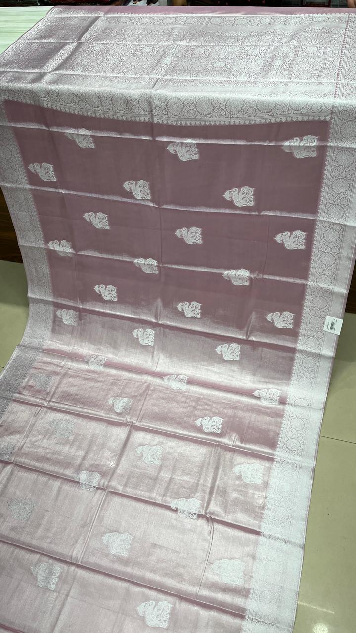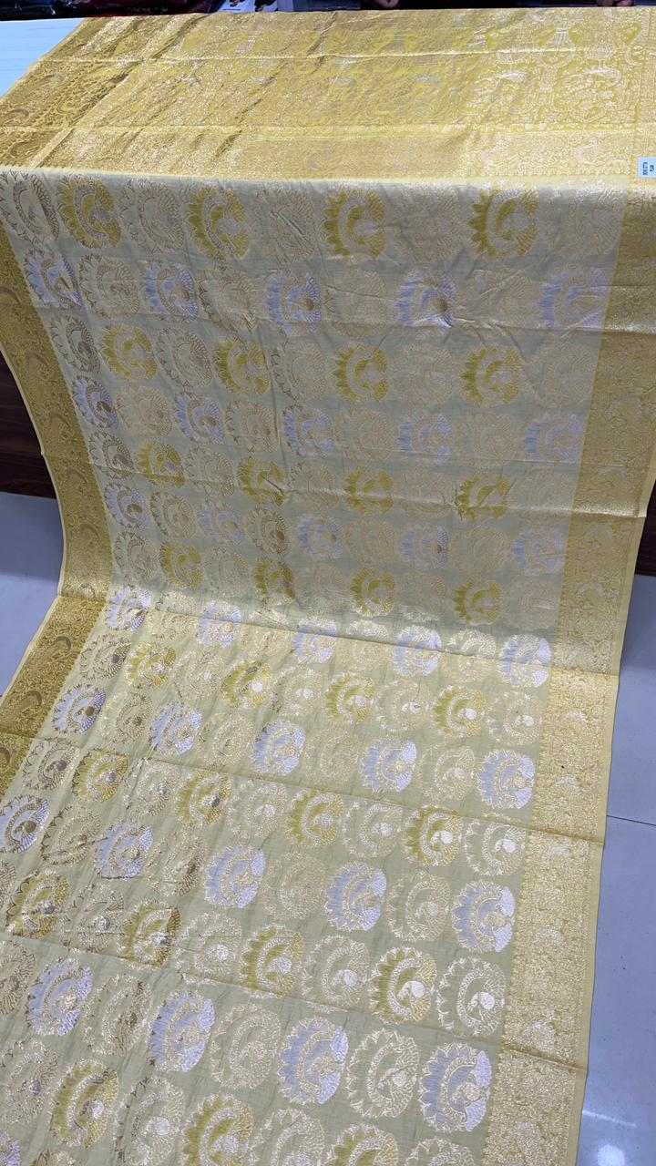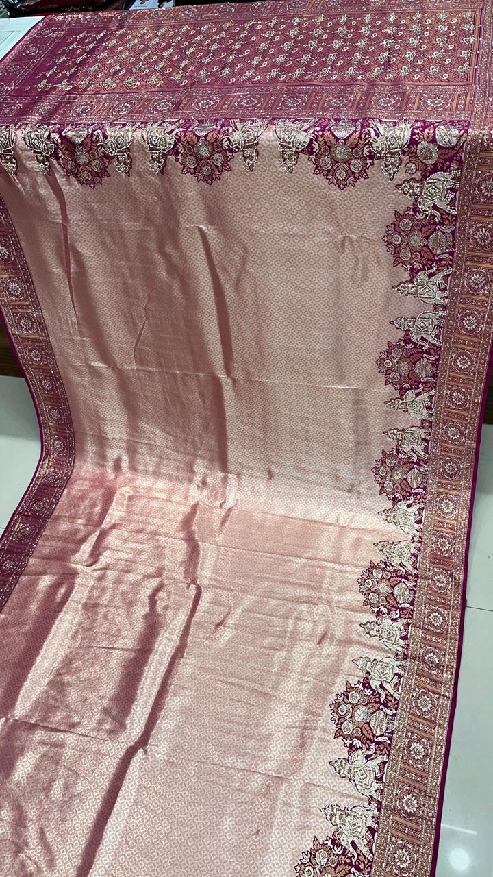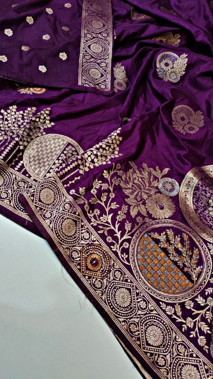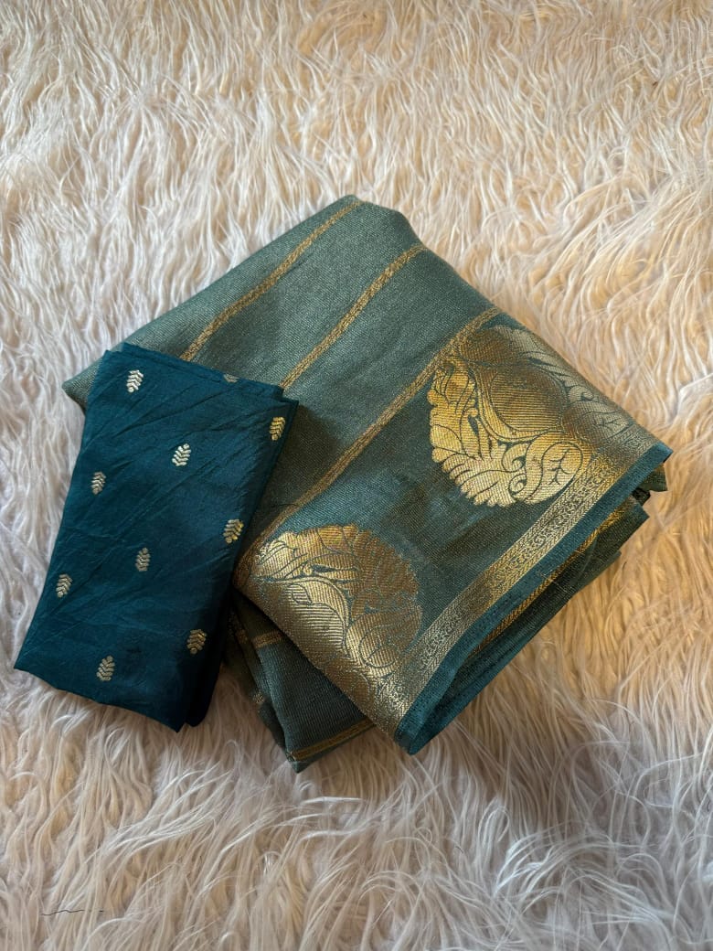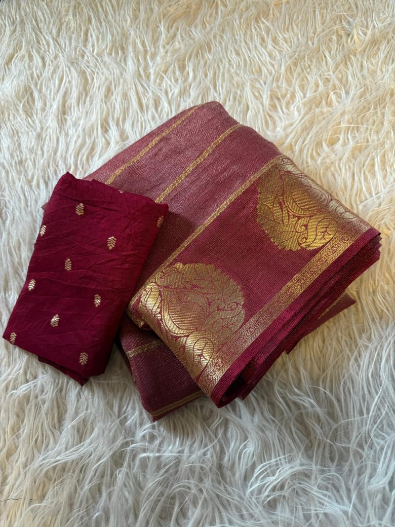 This beautiful saree is crafted from pure Mashru silk and features exquisite all-over peacock weaving that adds a regal and graceful touch. The saree is further enhanced with a necklace-designed woven border, giving it a statement look. A heavy pallu adorned with intricate multicolour thread work elevates its richness and elegance. It is paired with a plain blouse complemented by a classic zari border, perfectly balancing simplicity with tradition for a stunning overall appearance.