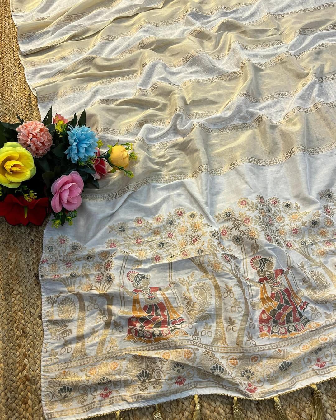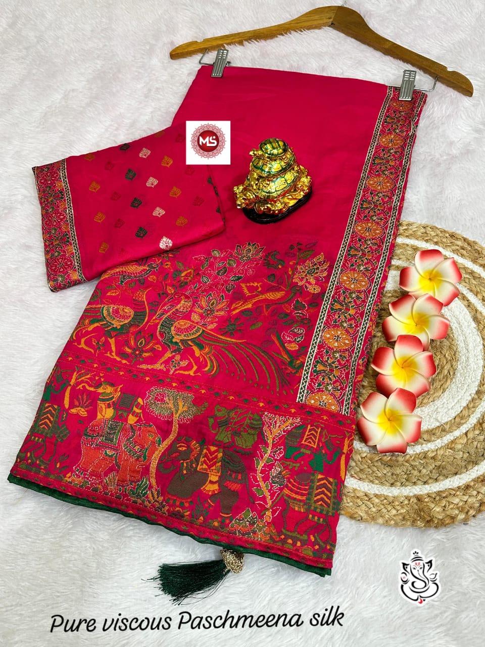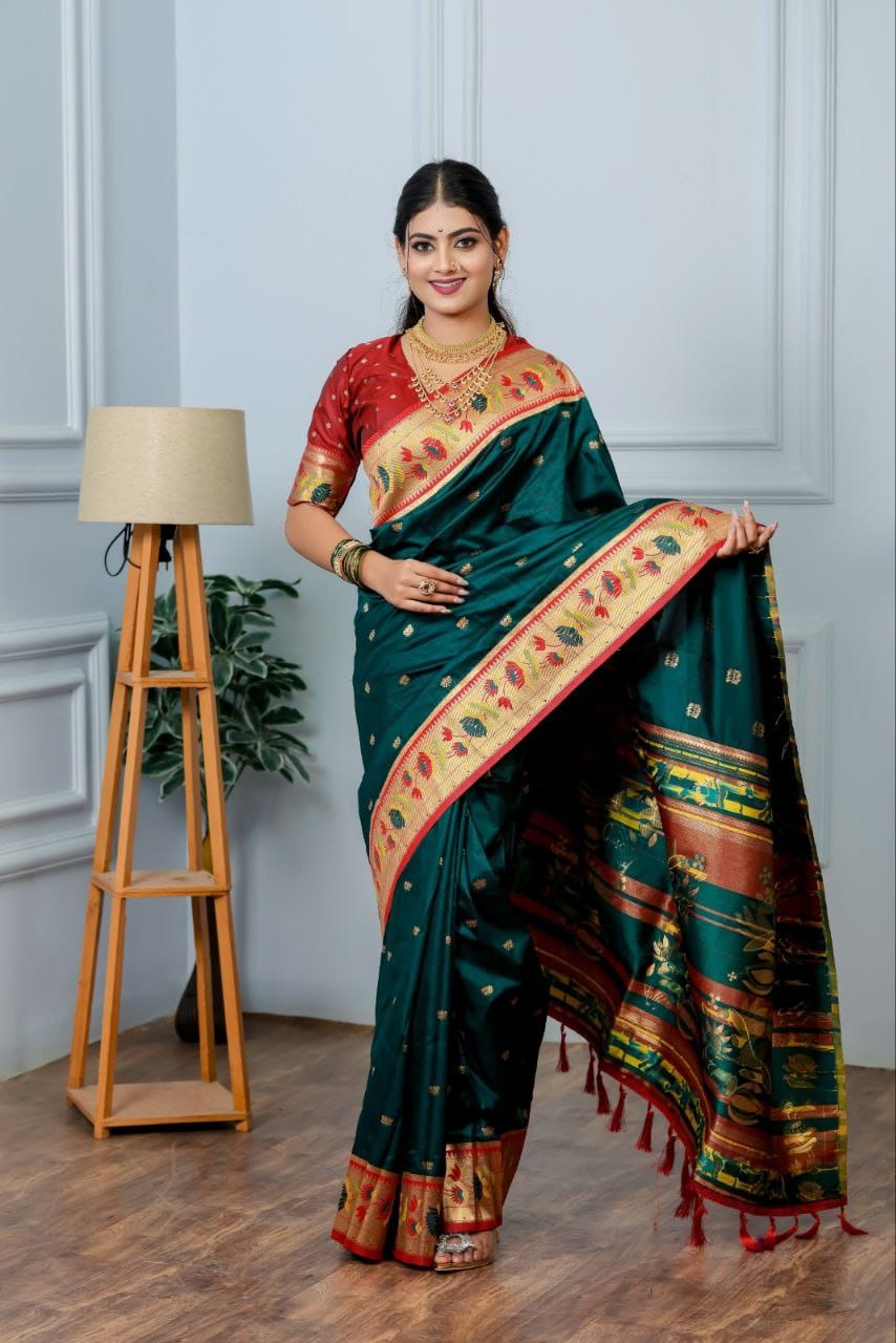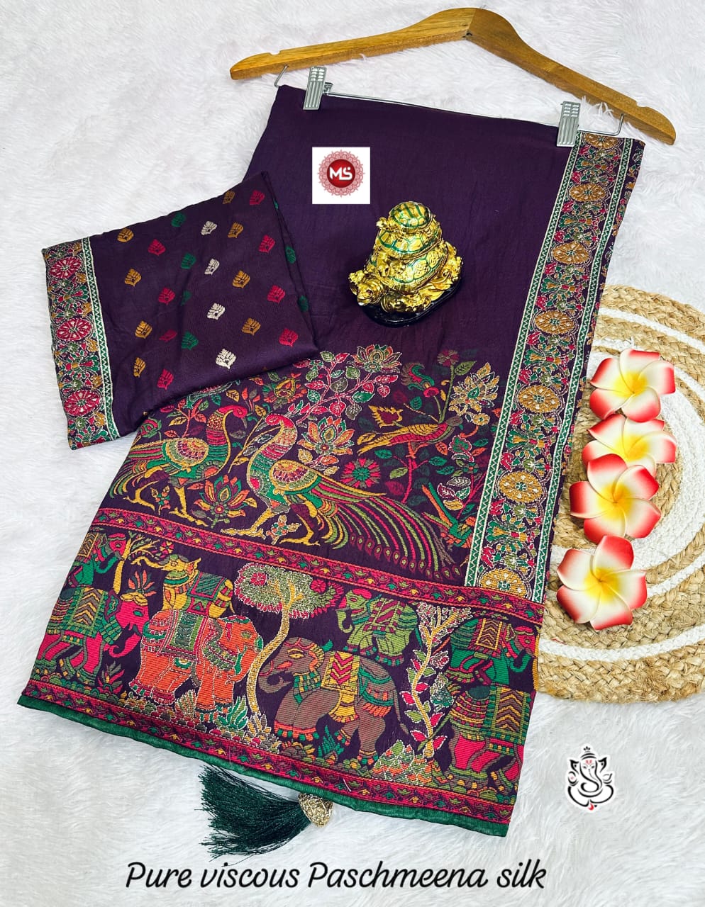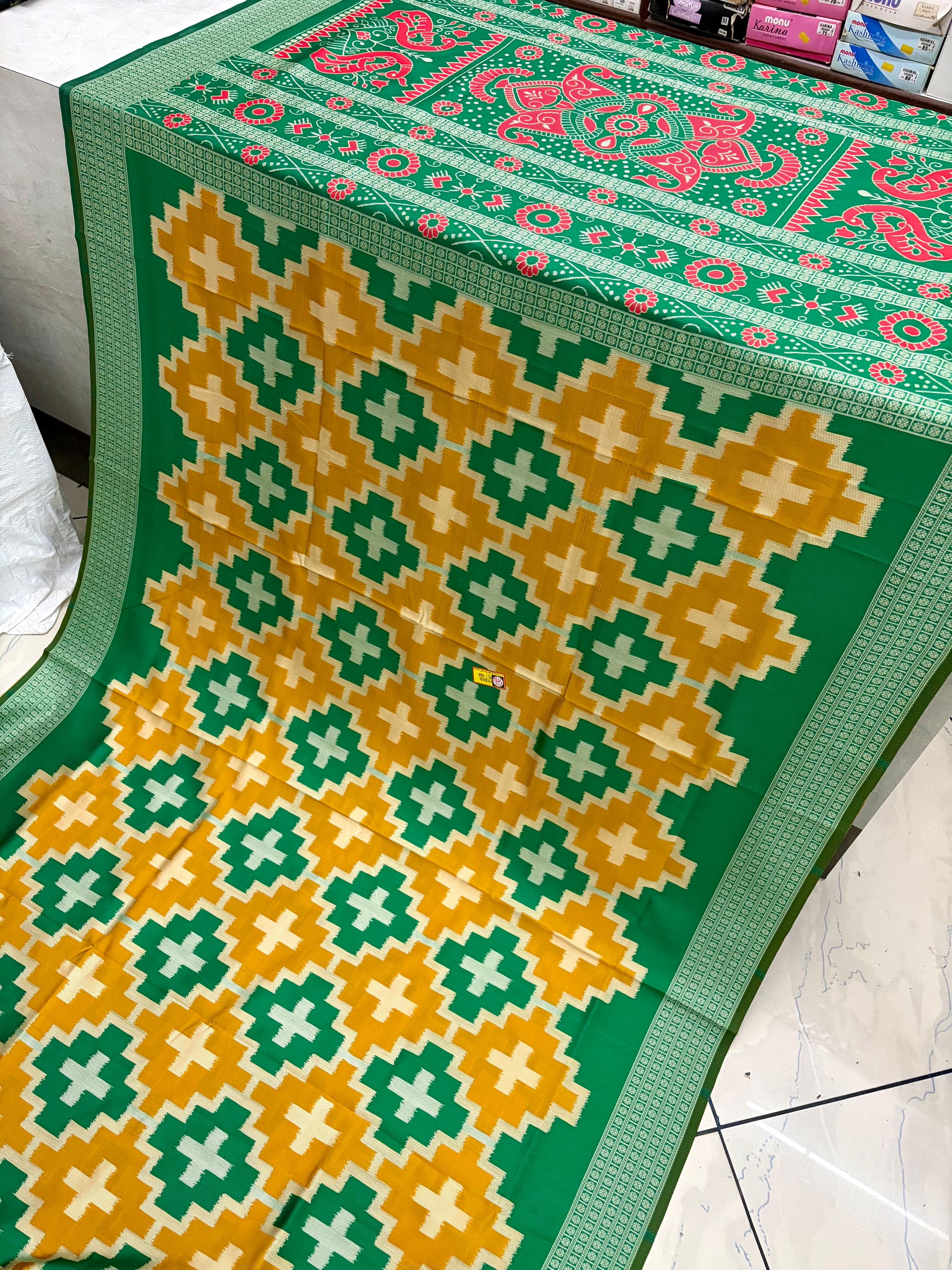 This beautiful saree is crafted from pure Mashru silk and features exquisite all-over peacock weaving that adds a regal and graceful touch. The saree is further enhanced with a necklace-designed woven border, giving it a statement look. A heavy pallu adorned with intricate multicolour thread work elevates its richness and elegance. It is paired with a plain blouse complemented by a classic zari border, perfectly balancing simplicity with tradition for a stunning overall appearance.