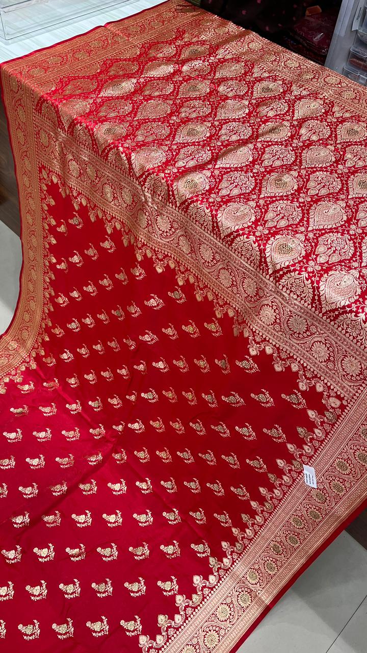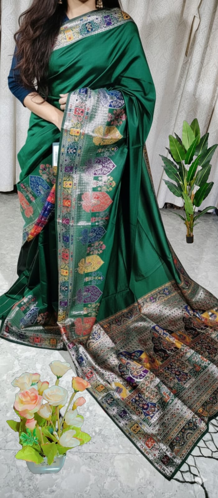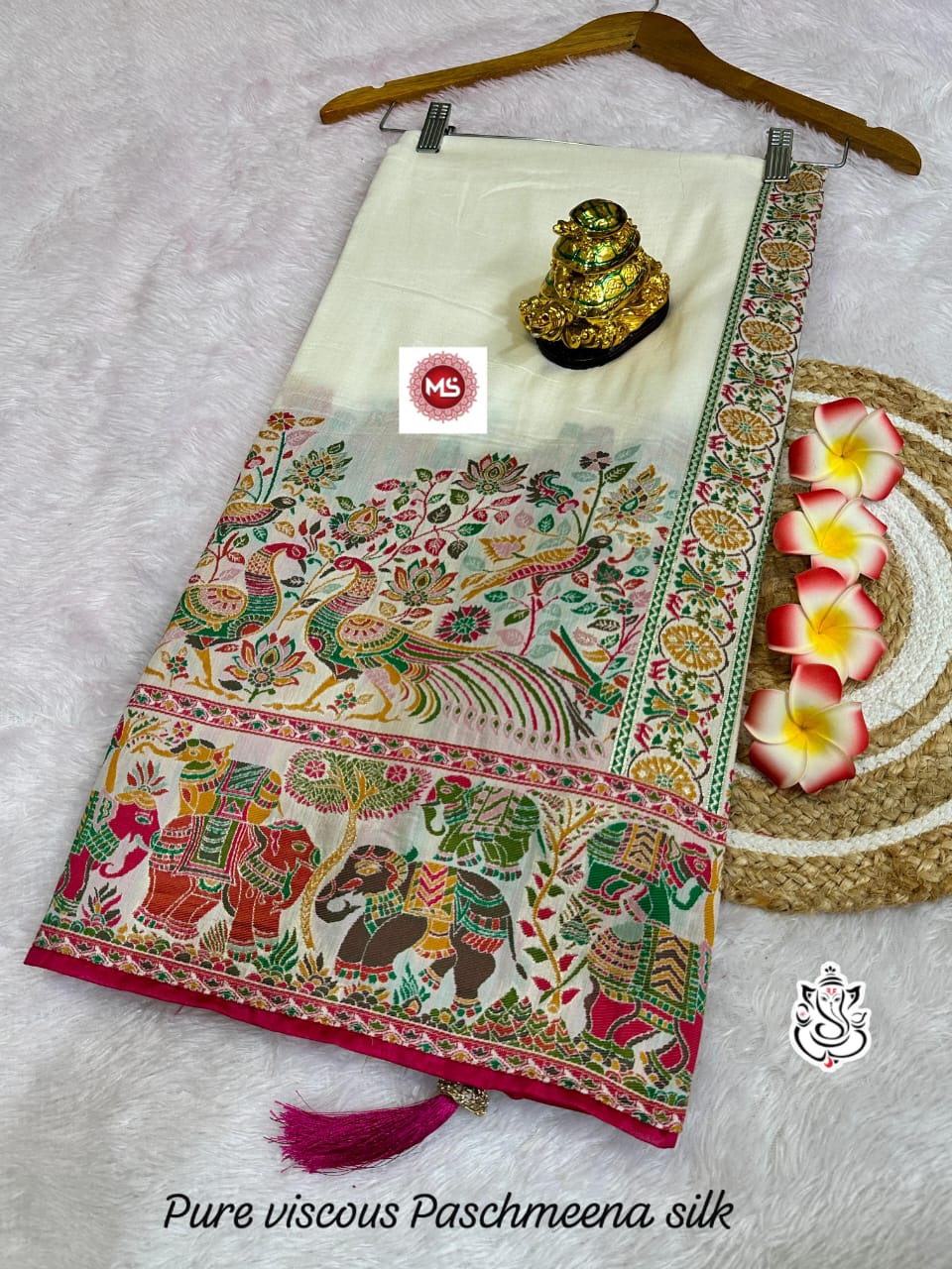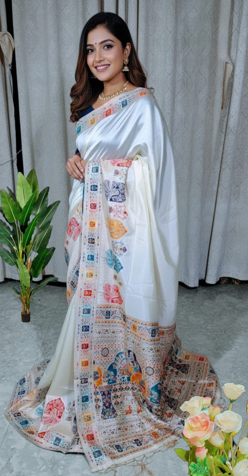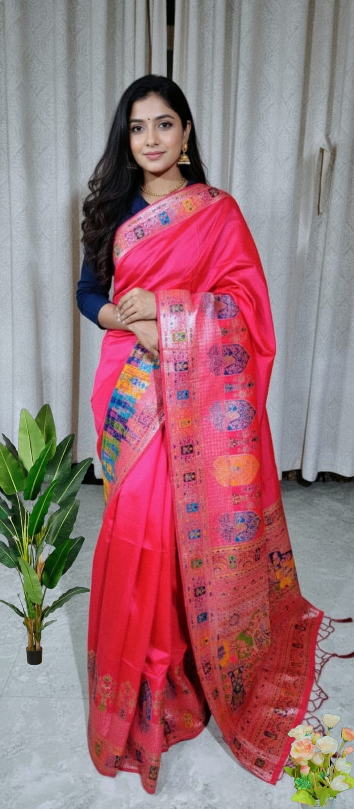 This beautiful saree is crafted from pure Mashru silk and features exquisite all-over peacock weaving that adds a regal and graceful touch. The saree is further enhanced with a necklace-designed woven border, giving it a statement look. A heavy pallu adorned with intricate multicolour thread work elevates its richness and elegance. It is paired with a plain blouse complemented by a classic zari border, perfectly balancing simplicity with tradition for a stunning overall appearance.