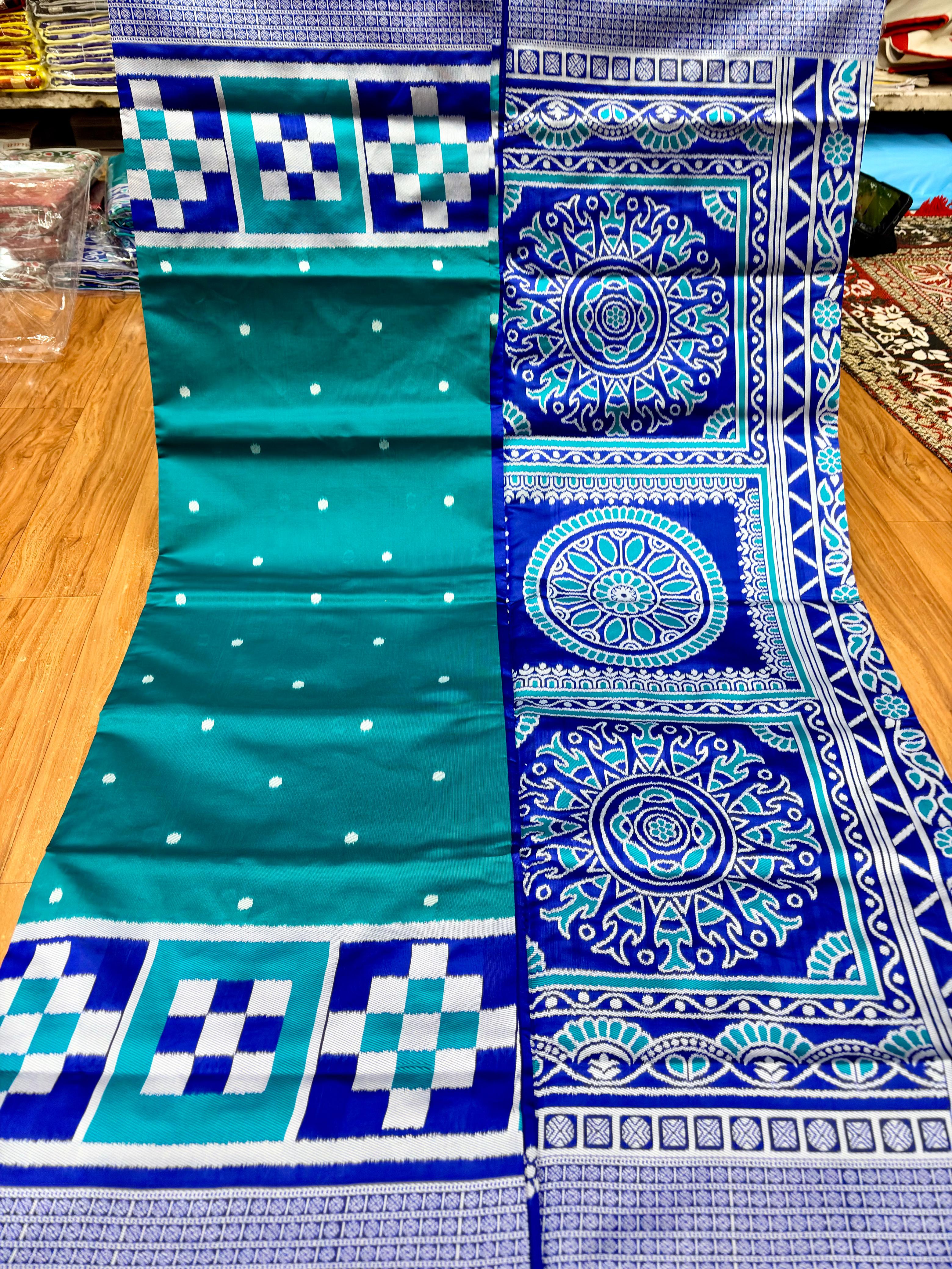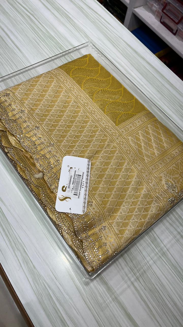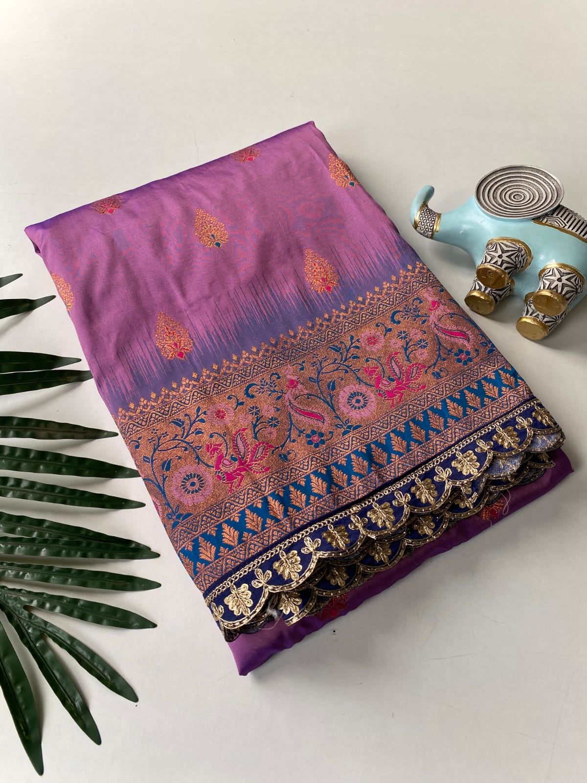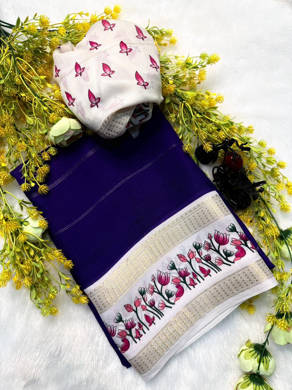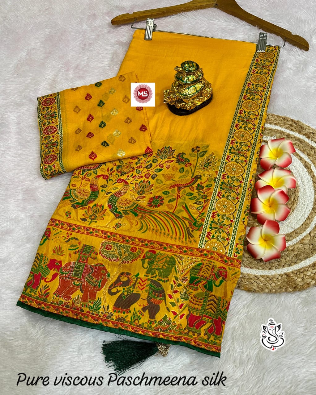 This beautiful saree is crafted from pure Mashru silk and features exquisite all-over peacock weaving that adds a regal and graceful touch. The saree is further enhanced with a necklace-designed woven border, giving it a statement look. A heavy pallu adorned with intricate multicolour thread work elevates its richness and elegance. It is paired with a plain blouse complemented by a classic zari border, perfectly balancing simplicity with tradition for a stunning overall appearance.