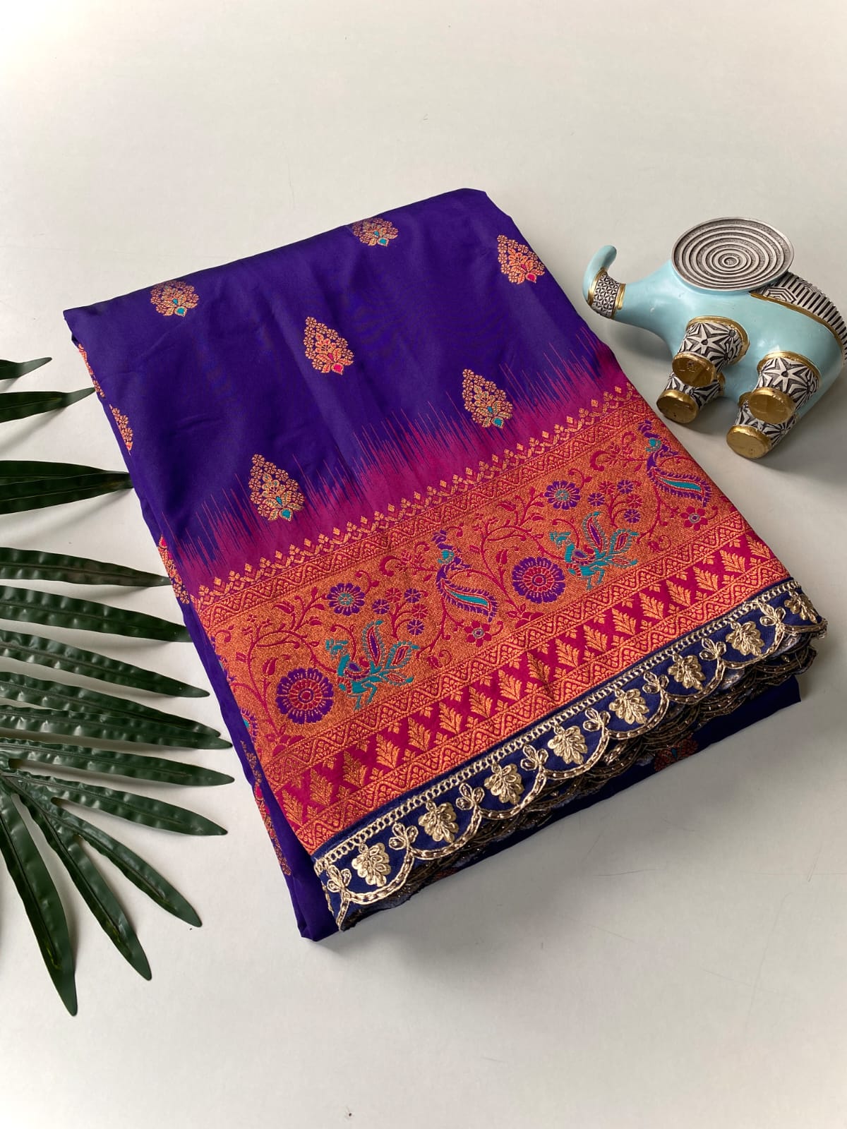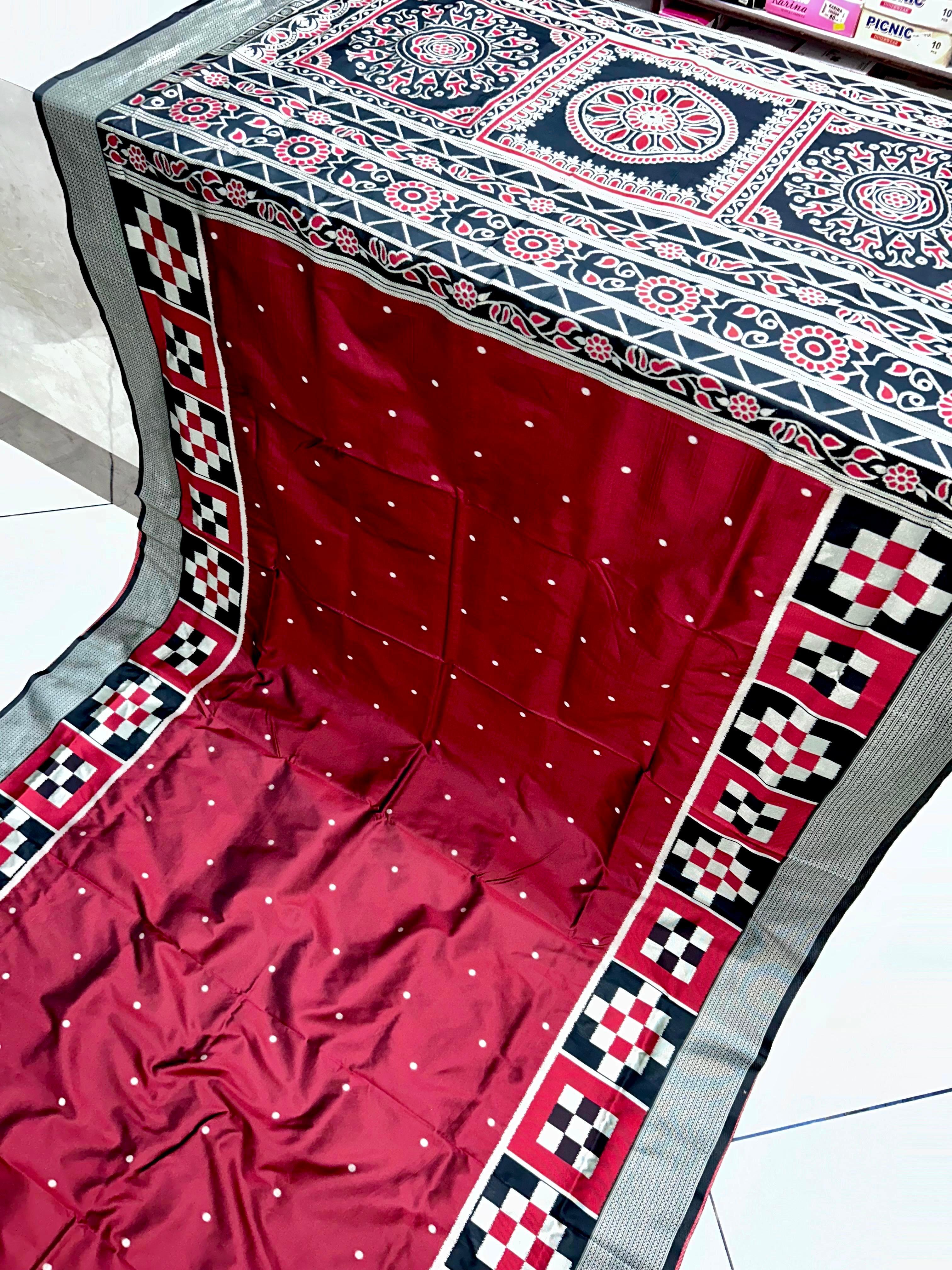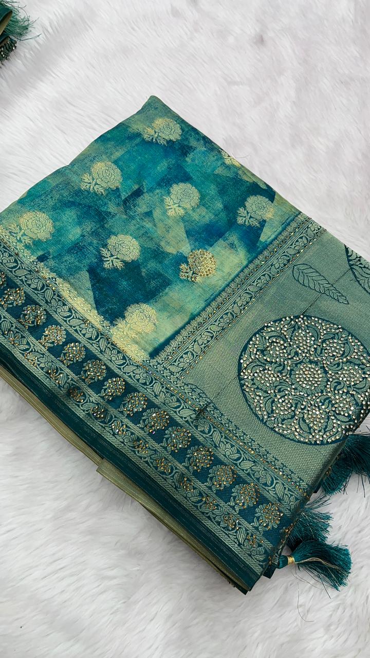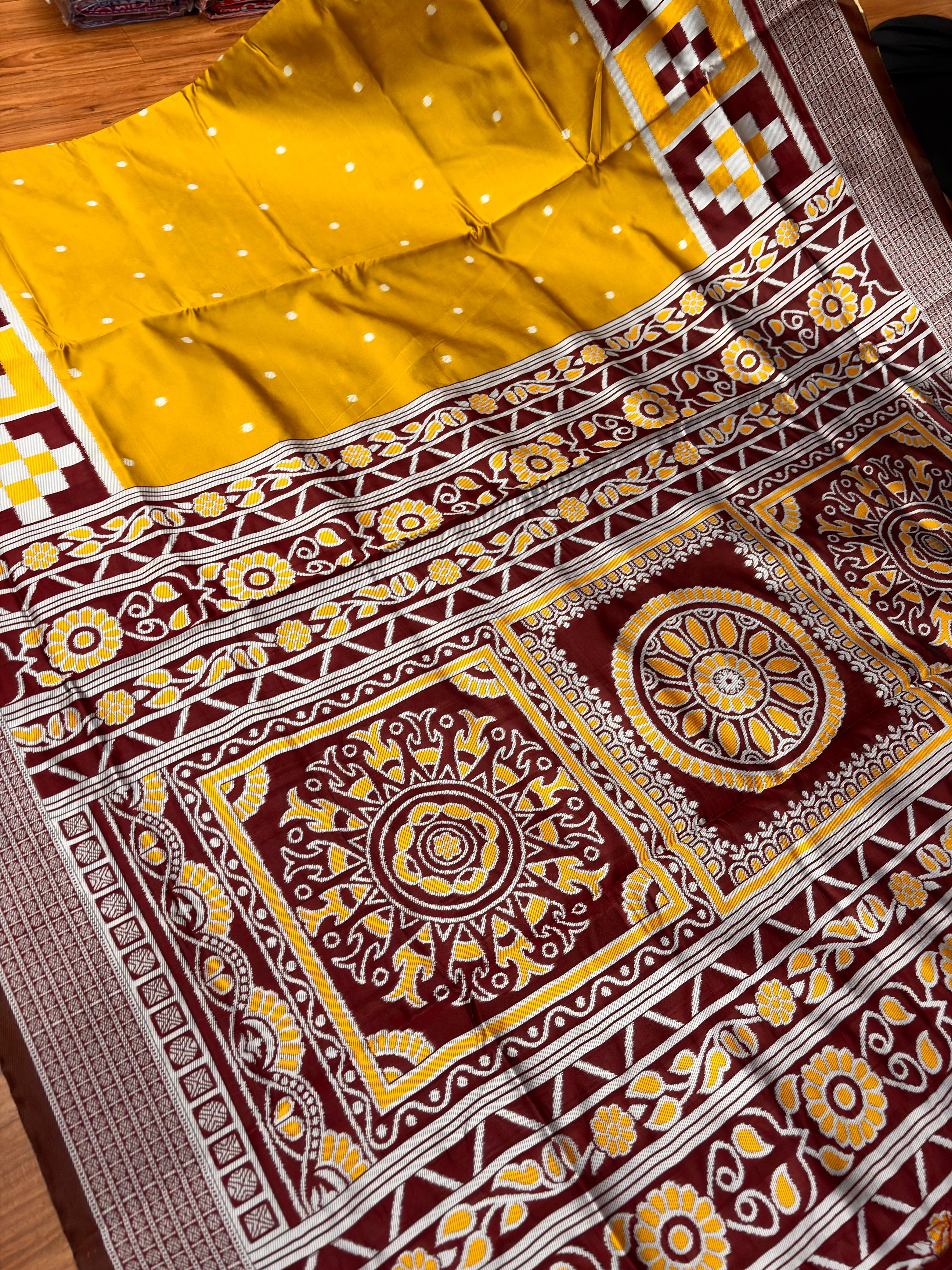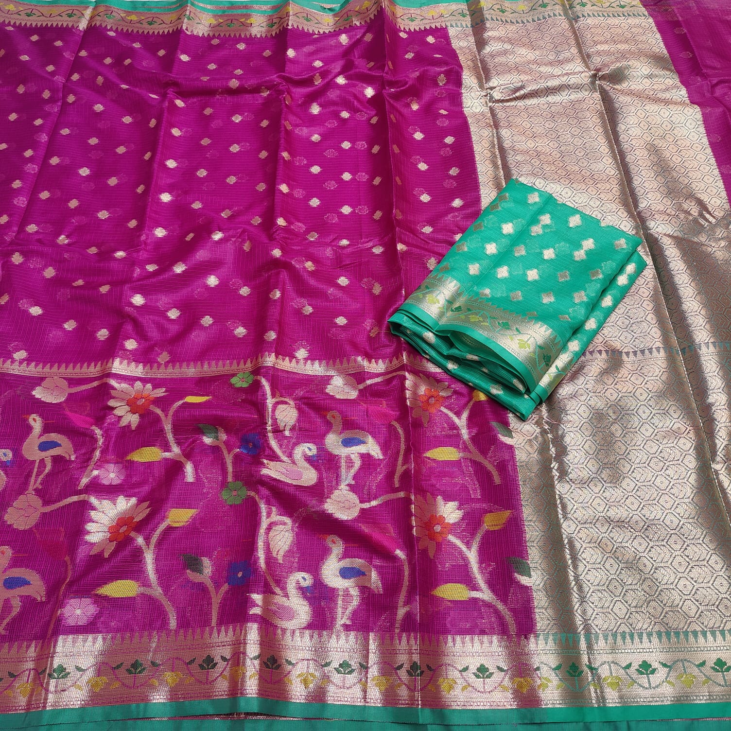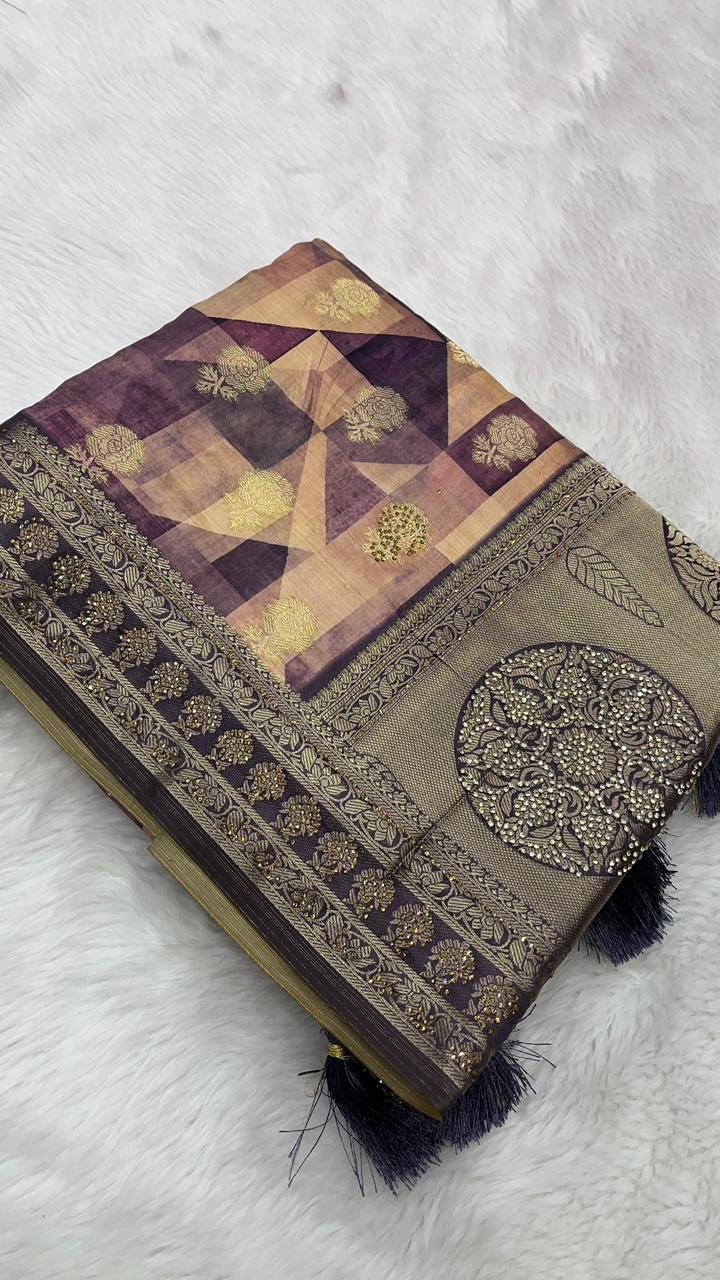 This beautiful saree is crafted from pure Mashru silk and features exquisite all-over peacock weaving that adds a regal and graceful touch. The saree is further enhanced with a necklace-designed woven border, giving it a statement look. A heavy pallu adorned with intricate multicolour thread work elevates its richness and elegance. It is paired with a plain blouse complemented by a classic zari border, perfectly balancing simplicity with tradition for a stunning overall appearance.