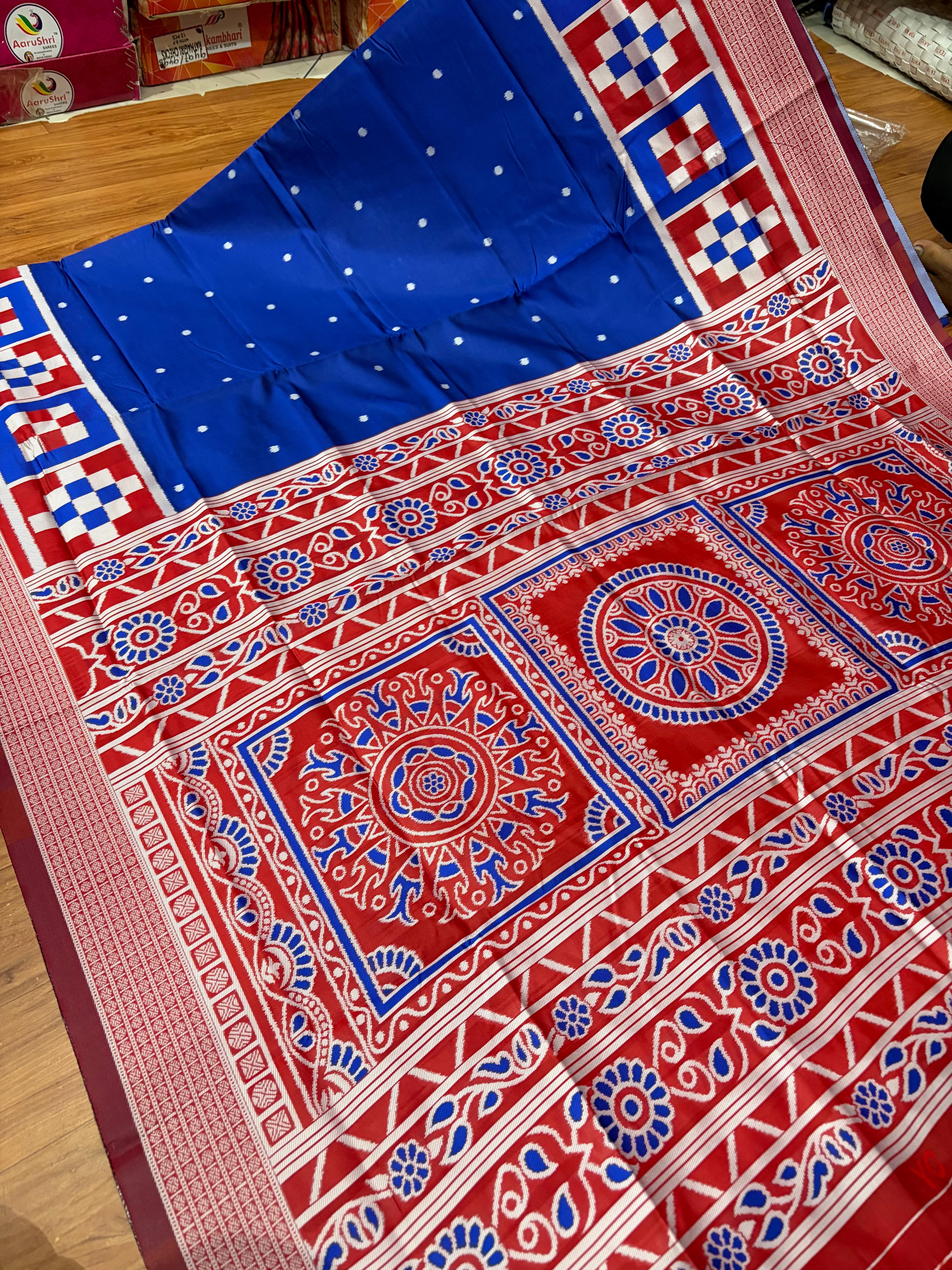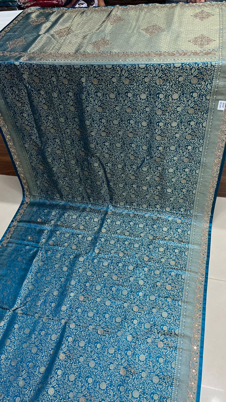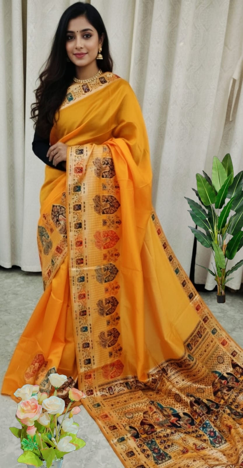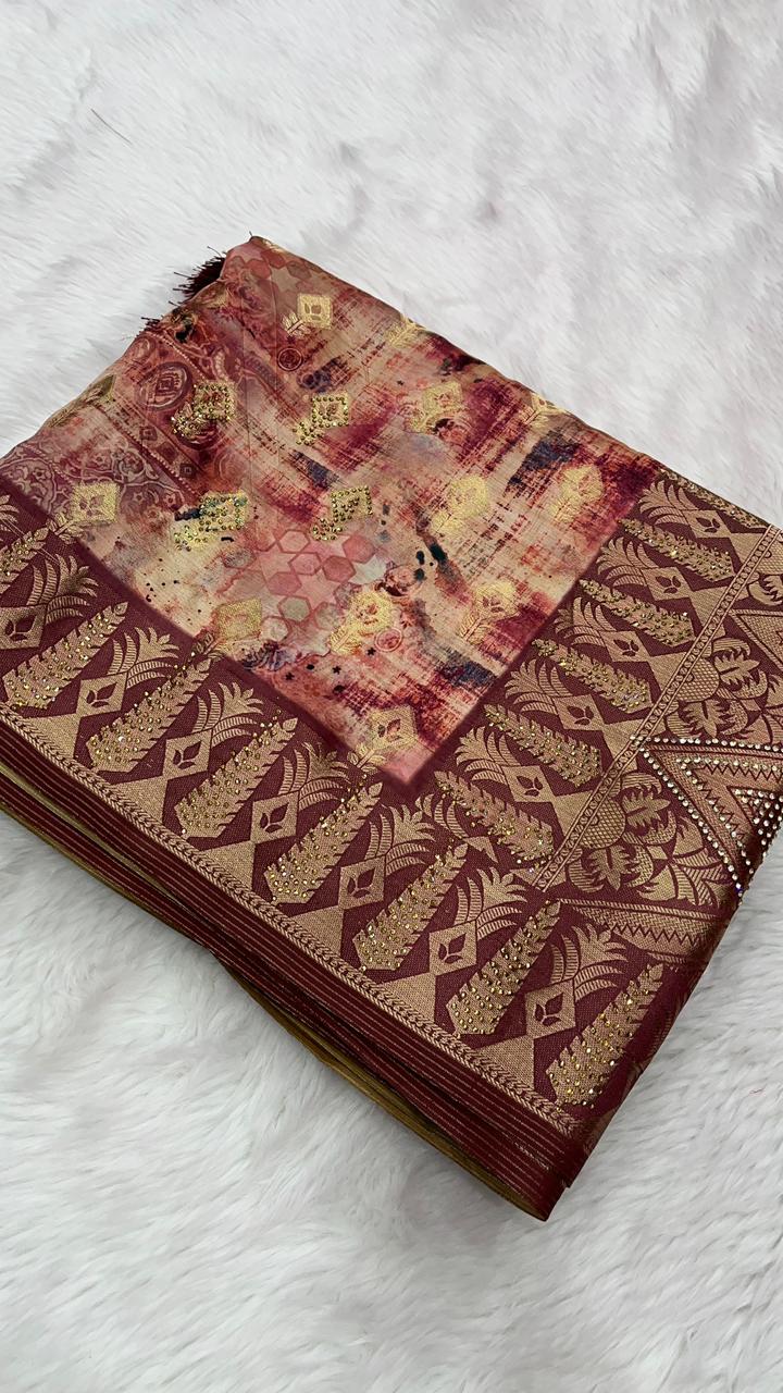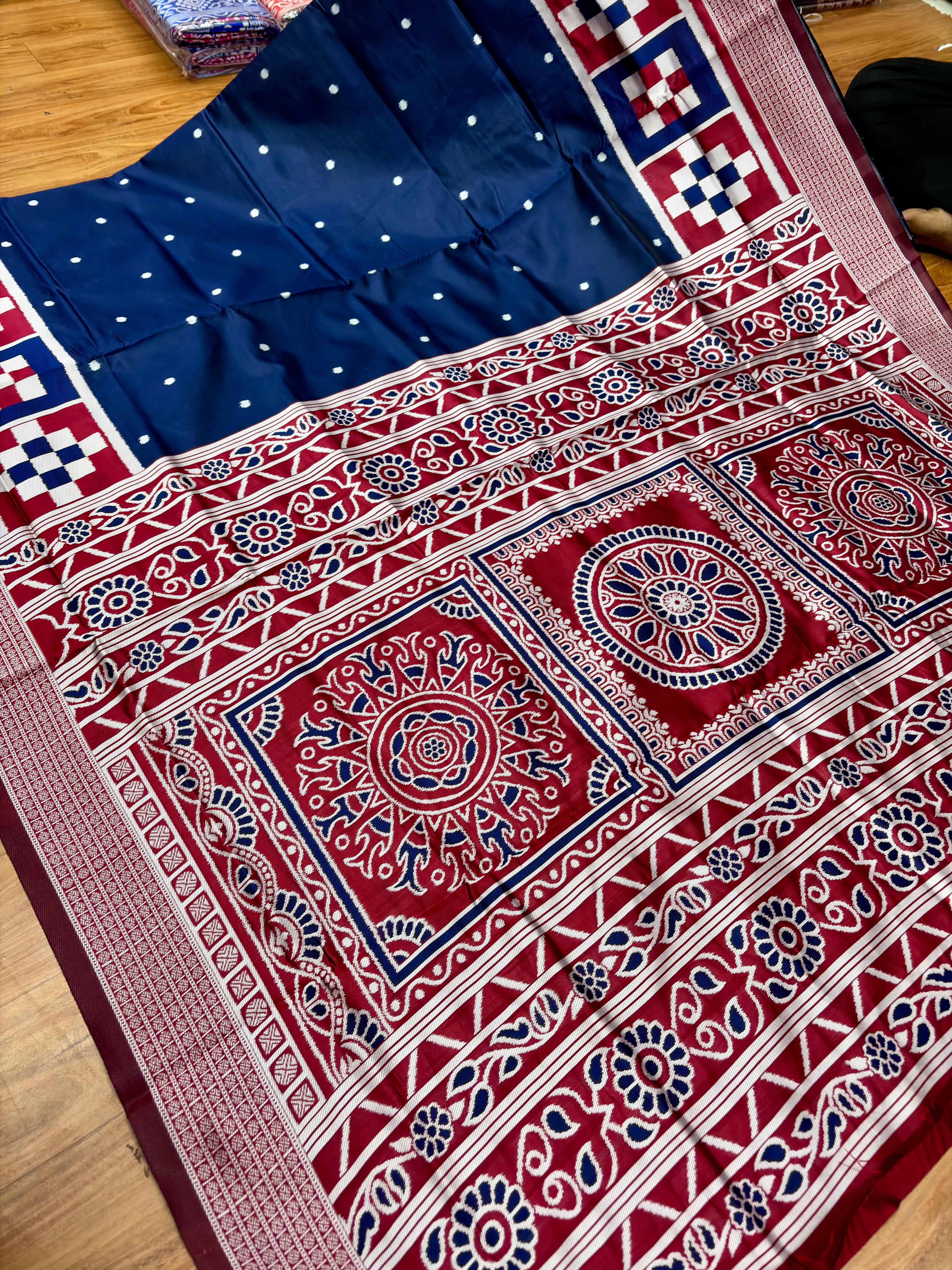This beautiful saree is crafted from pure Mashru silk and features exquisite all-over peacock weaving that adds a regal and graceful touch. The saree is further enhanced with a necklace-designed woven border, giving it a statement look. A heavy pallu adorned with intricate multicolour thread work elevates its richness and elegance. It is paired with a plain blouse complemented by a classic zari border, perfectly balancing simplicity with tradition for a stunning overall appearance.