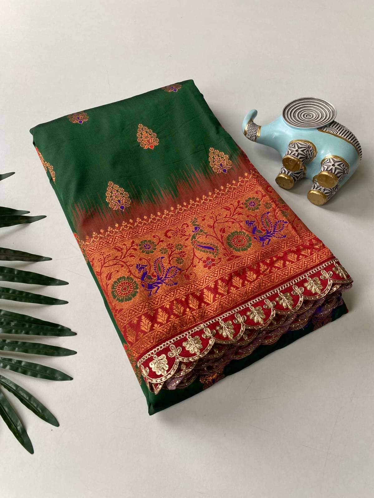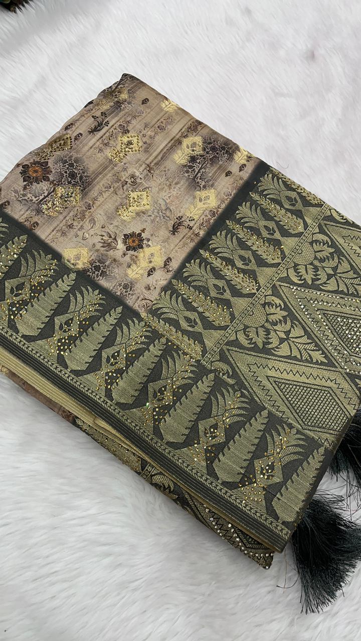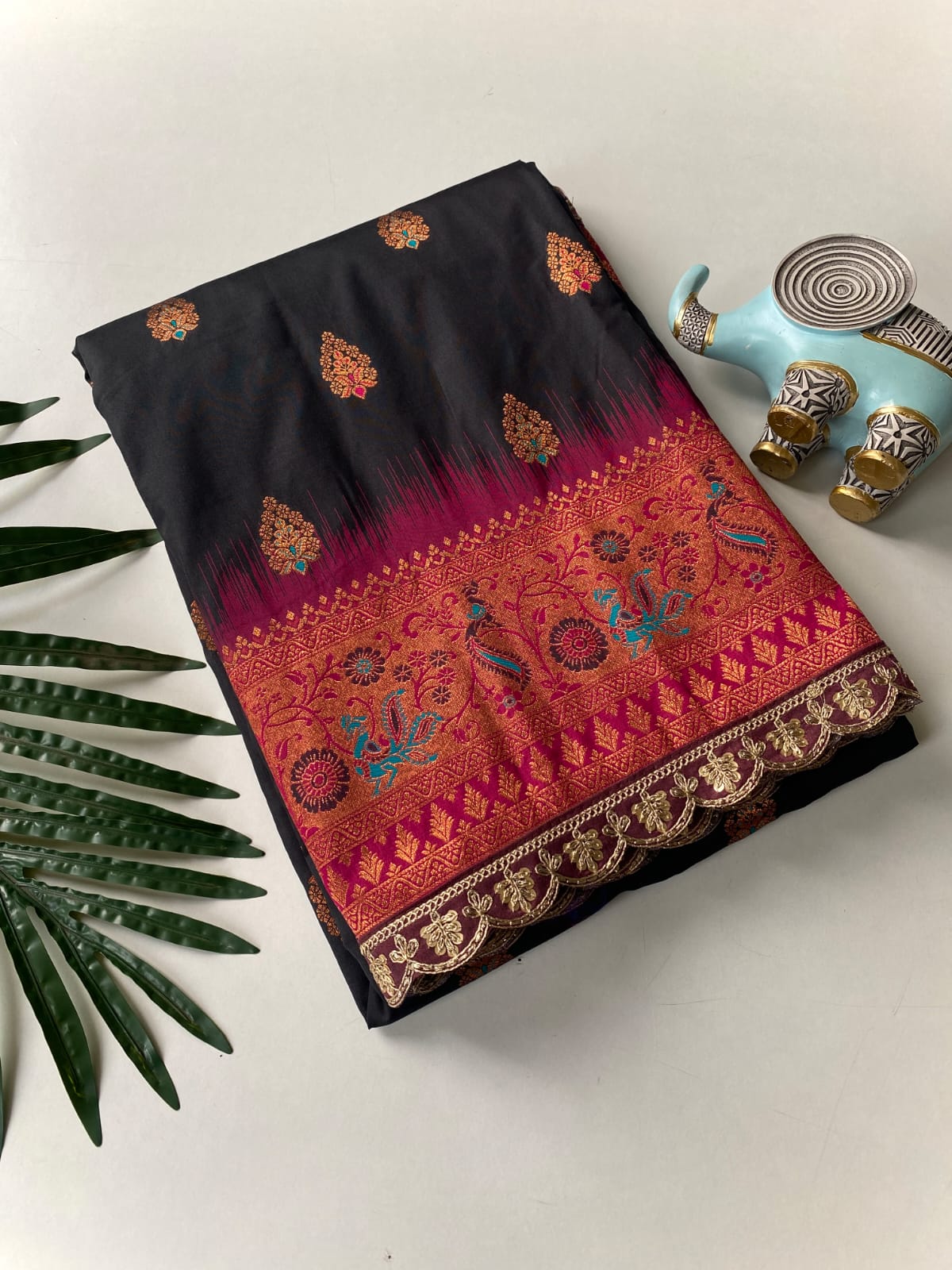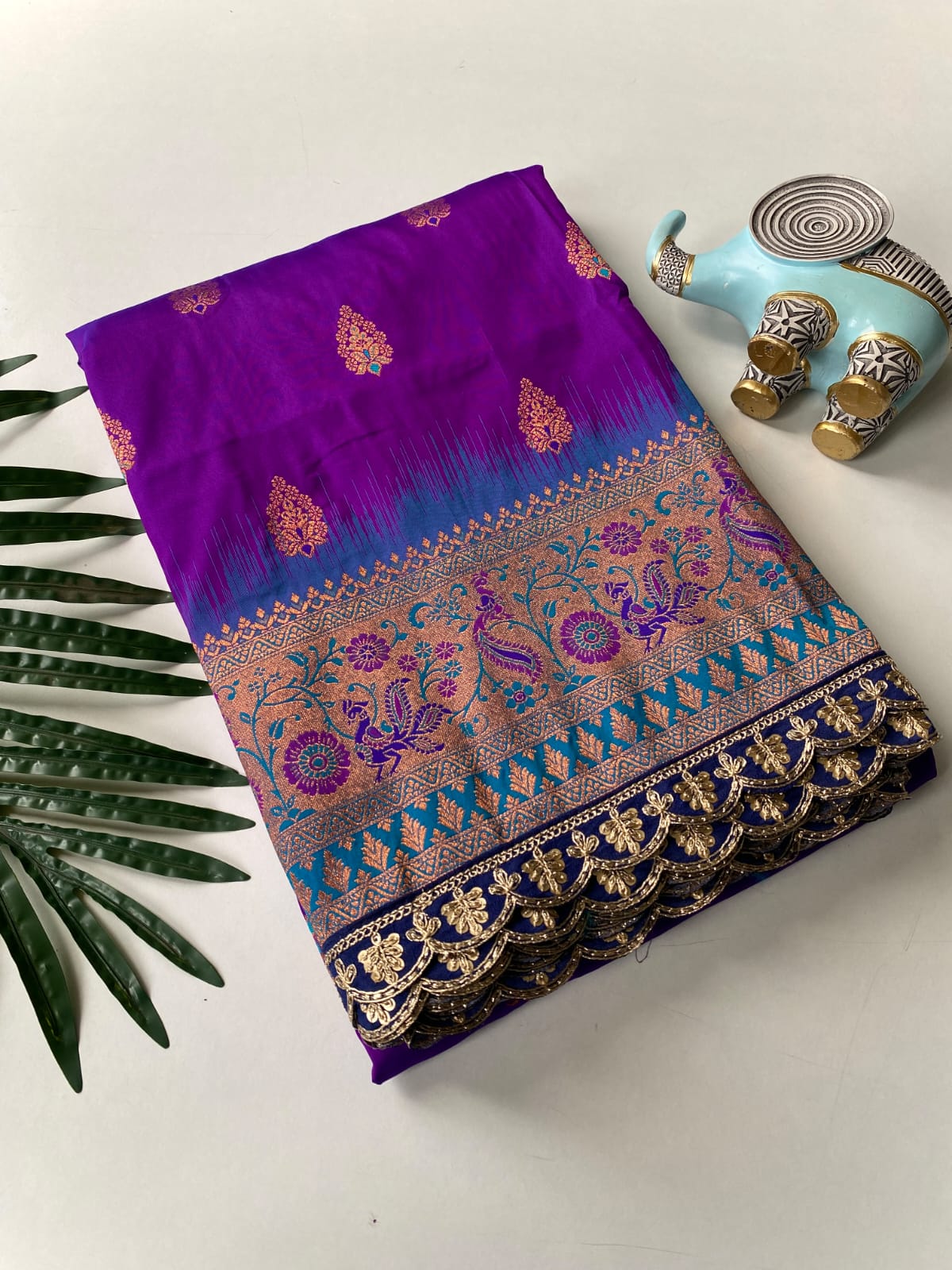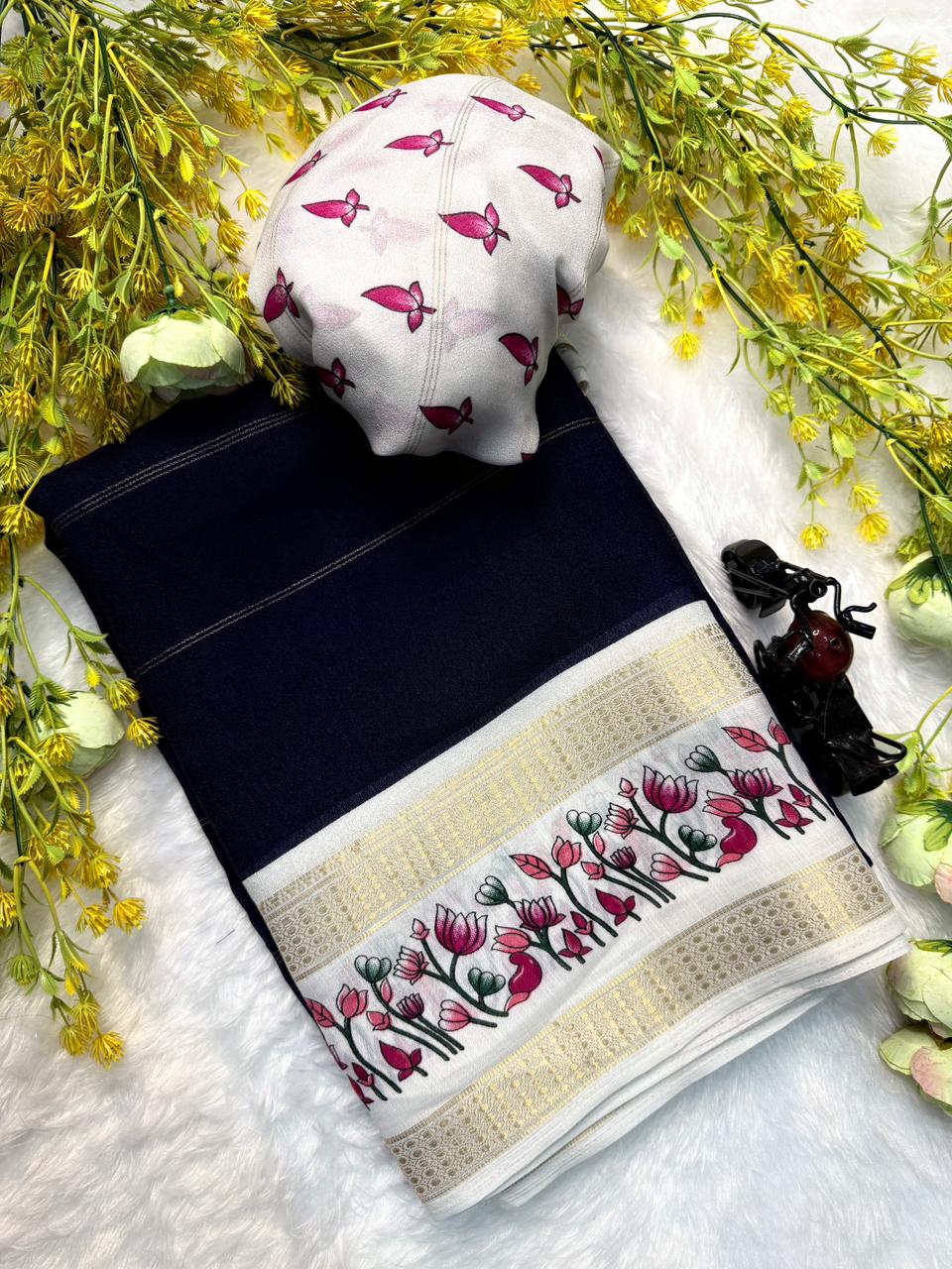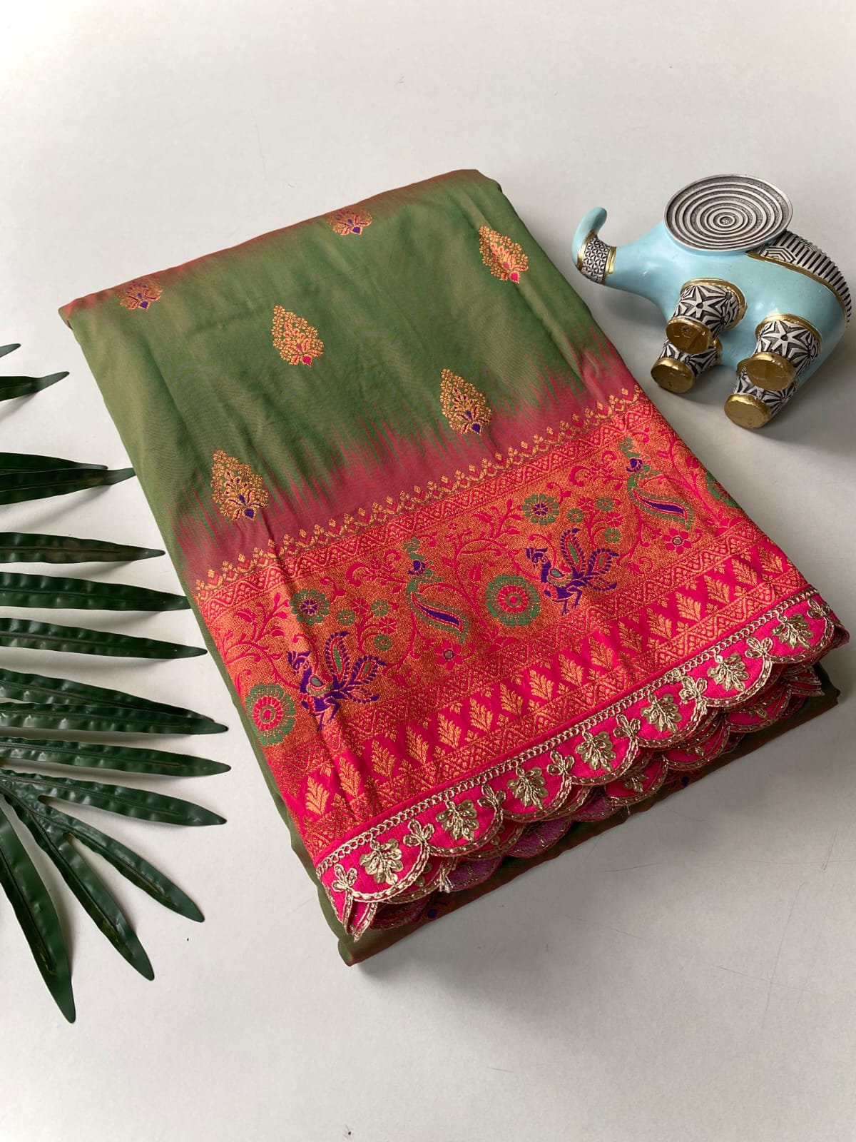 This beautiful saree is crafted from pure Mashru silk and features exquisite all-over peacock weaving that adds a regal and graceful touch. The saree is further enhanced with a necklace-designed woven border, giving it a statement look. A heavy pallu adorned with intricate multicolour thread work elevates its richness and elegance. It is paired with a plain blouse complemented by a classic zari border, perfectly balancing simplicity with tradition for a stunning overall appearance.