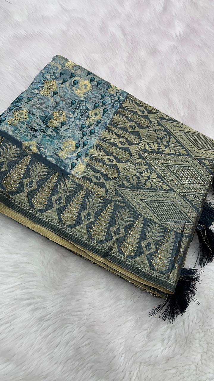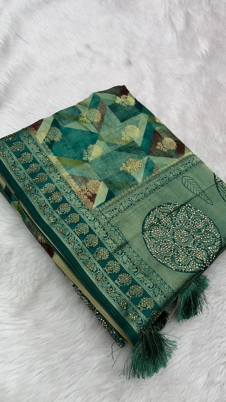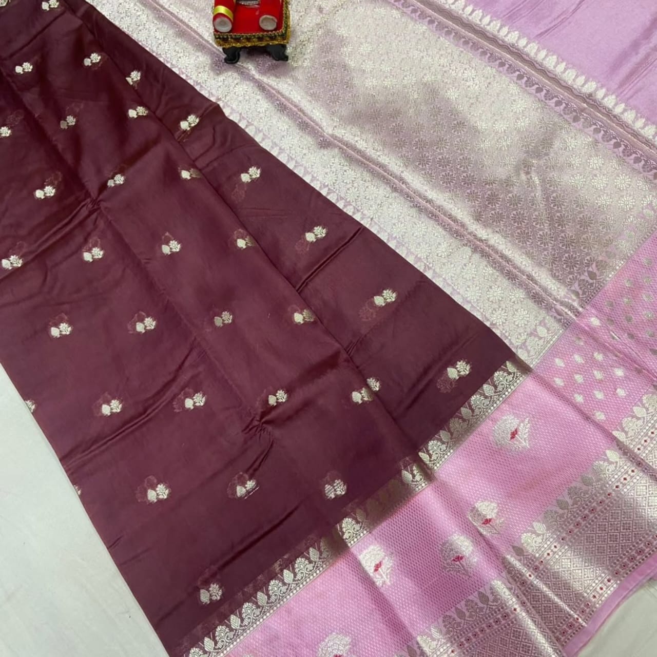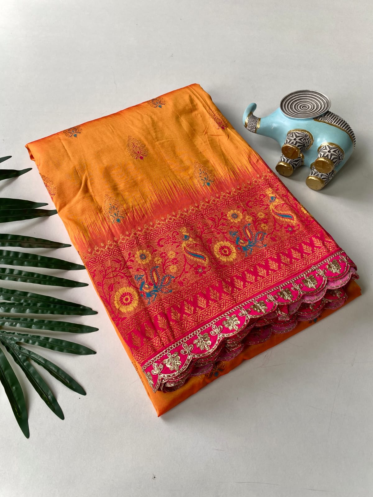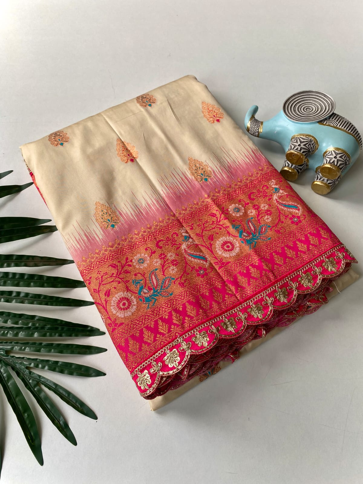This beautiful saree is crafted from pure Mashru silk and features exquisite all-over peacock weaving that adds a regal and graceful touch. The saree is further enhanced with a necklace-designed woven border, giving it a statement look. A heavy pallu adorned with intricate multicolour thread work elevates its richness and elegance. It is paired with a plain blouse complemented by a classic zari border, perfectly balancing simplicity with tradition for a stunning overall appearance.