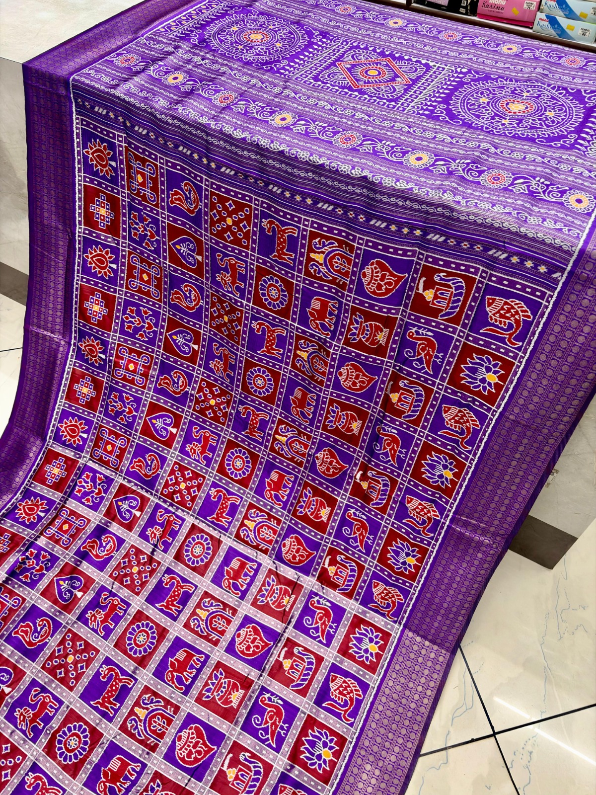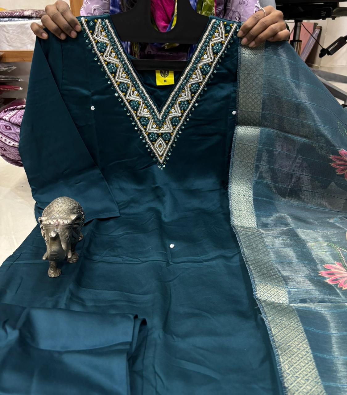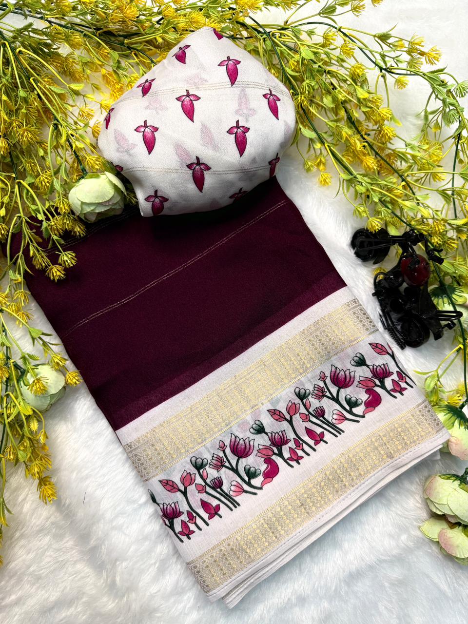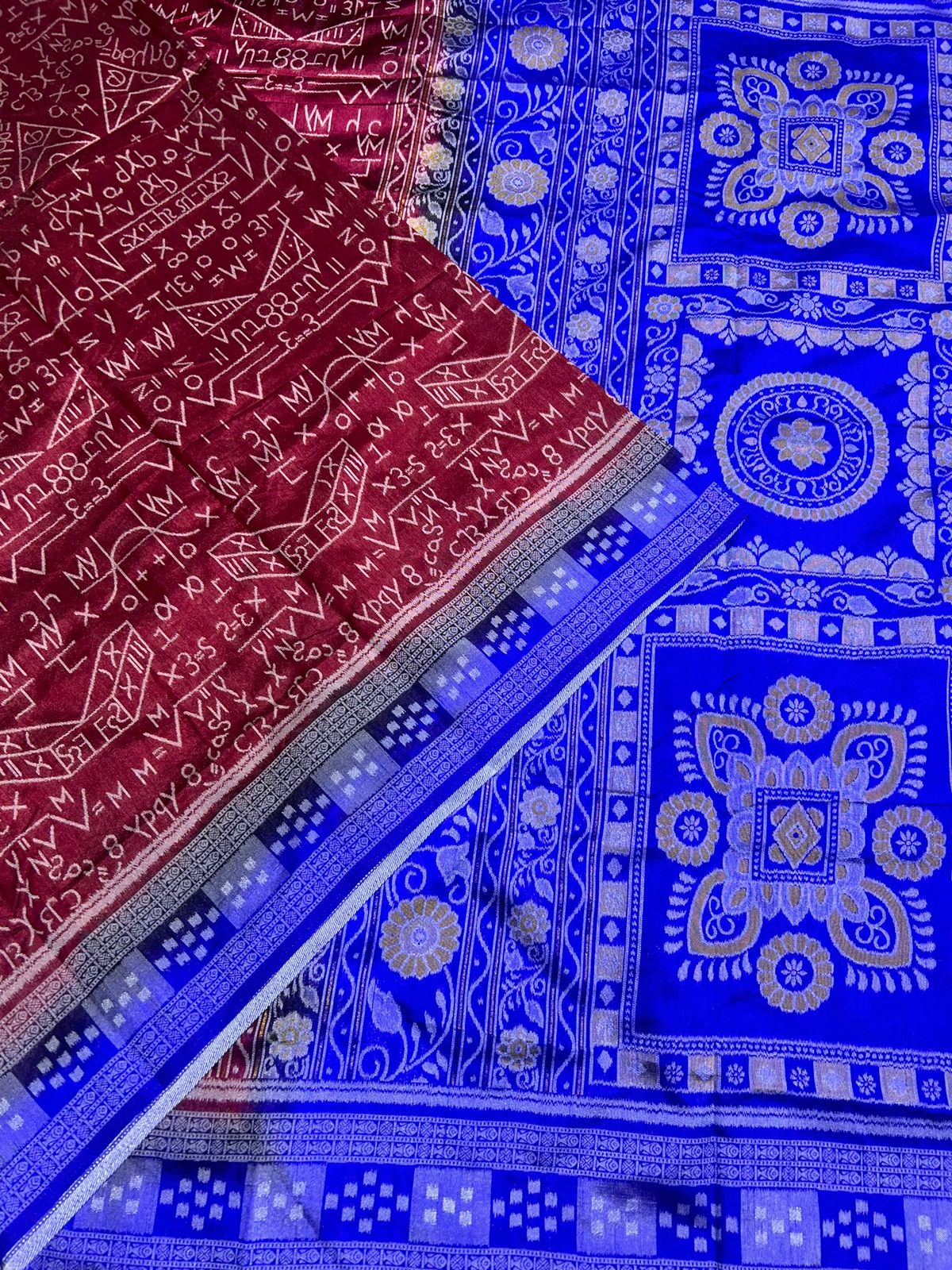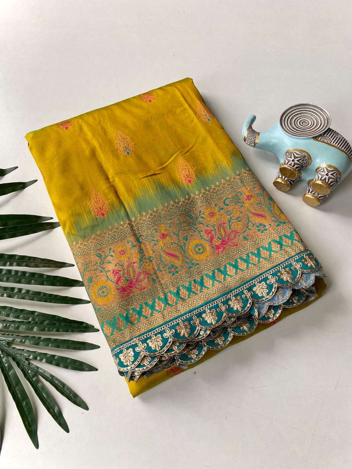 This beautiful saree is crafted from pure Mashru silk and features exquisite all-over peacock weaving that adds a regal and graceful touch. The saree is further enhanced with a necklace-designed woven border, giving it a statement look. A heavy pallu adorned with intricate multicolour thread work elevates its richness and elegance. It is paired with a plain blouse complemented by a classic zari border, perfectly balancing simplicity with tradition for a stunning overall appearance.