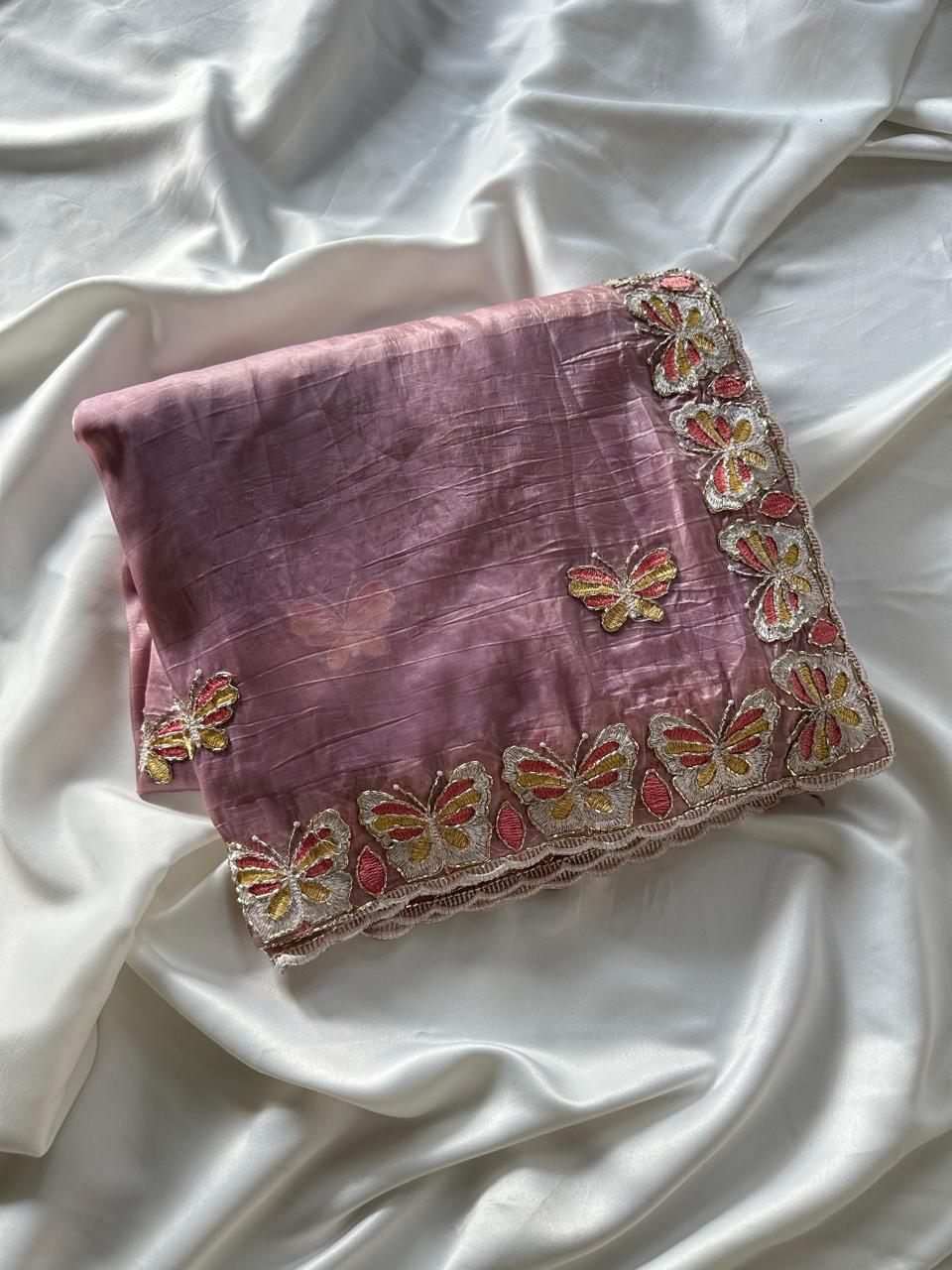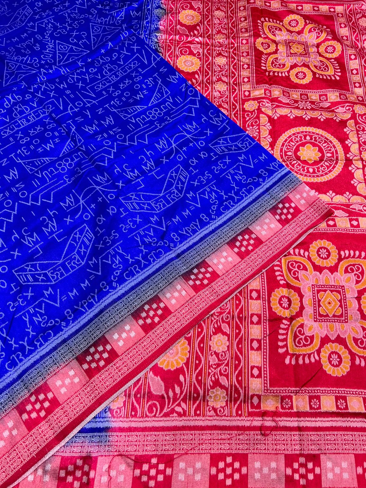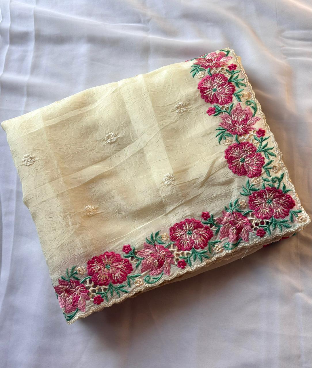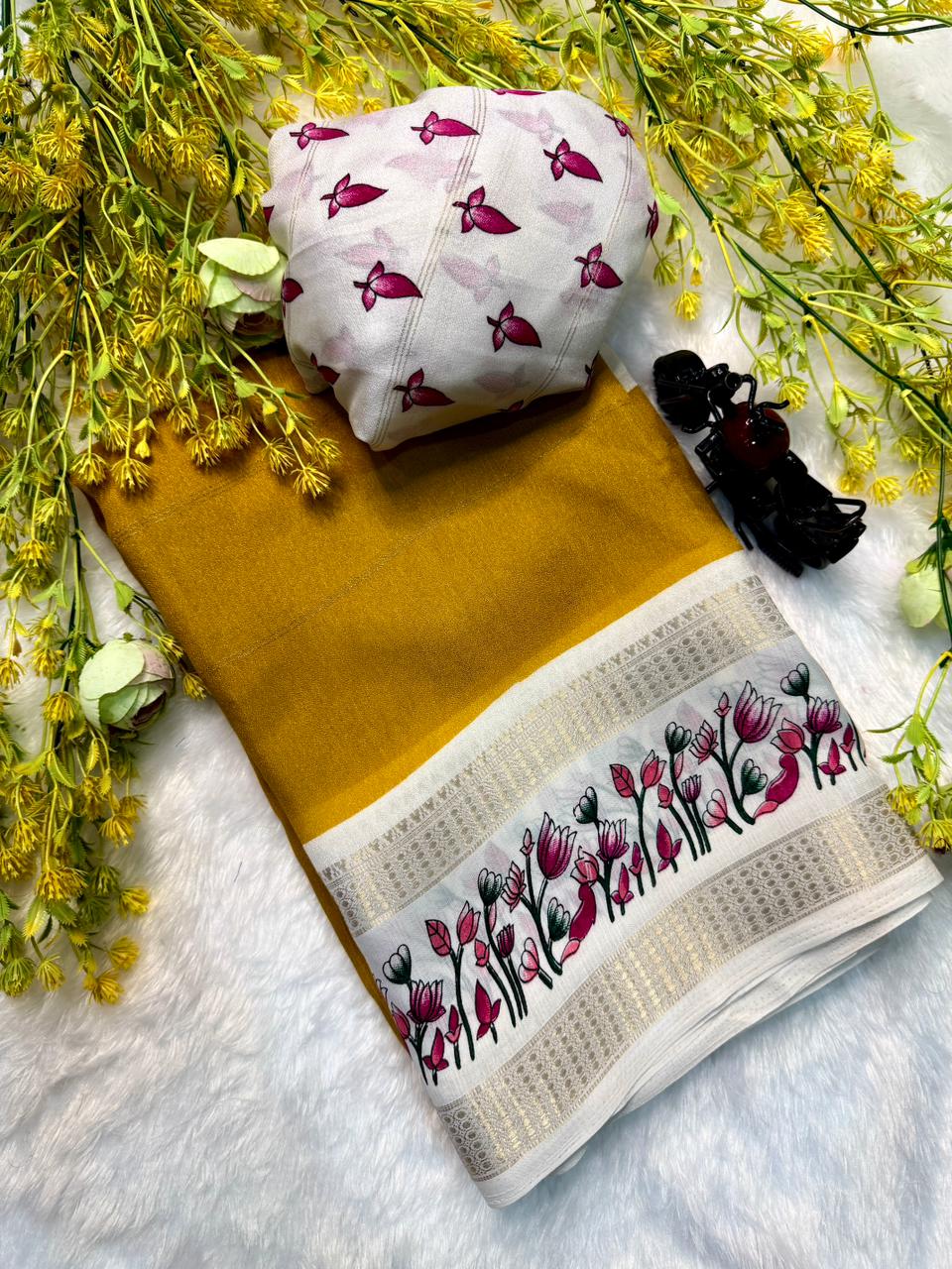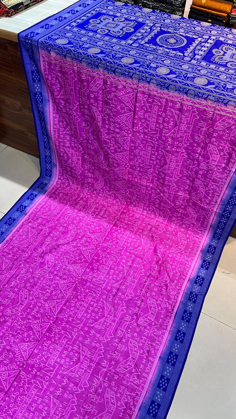 This beautiful saree is crafted from pure Mashru silk and features exquisite all-over peacock weaving that adds a regal and graceful touch. The saree is further enhanced with a necklace-designed woven border, giving it a statement look. A heavy pallu adorned with intricate multicolour thread work elevates its richness and elegance. It is paired with a plain blouse complemented by a classic zari border, perfectly balancing simplicity with tradition for a stunning overall appearance.