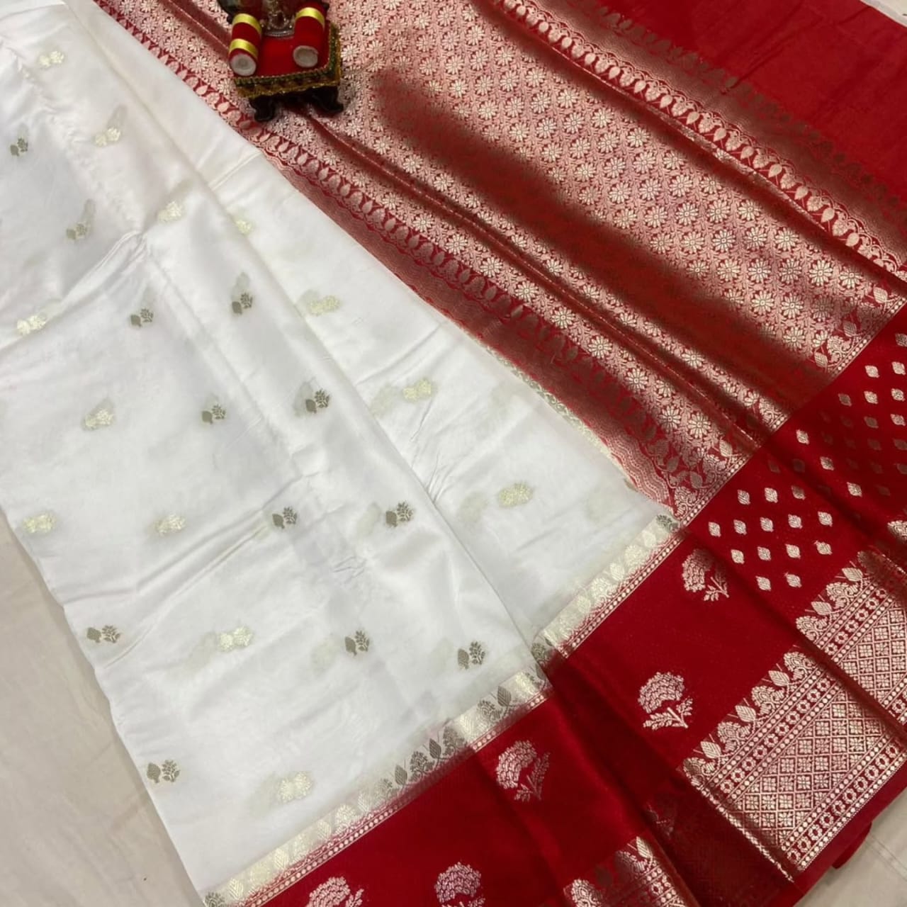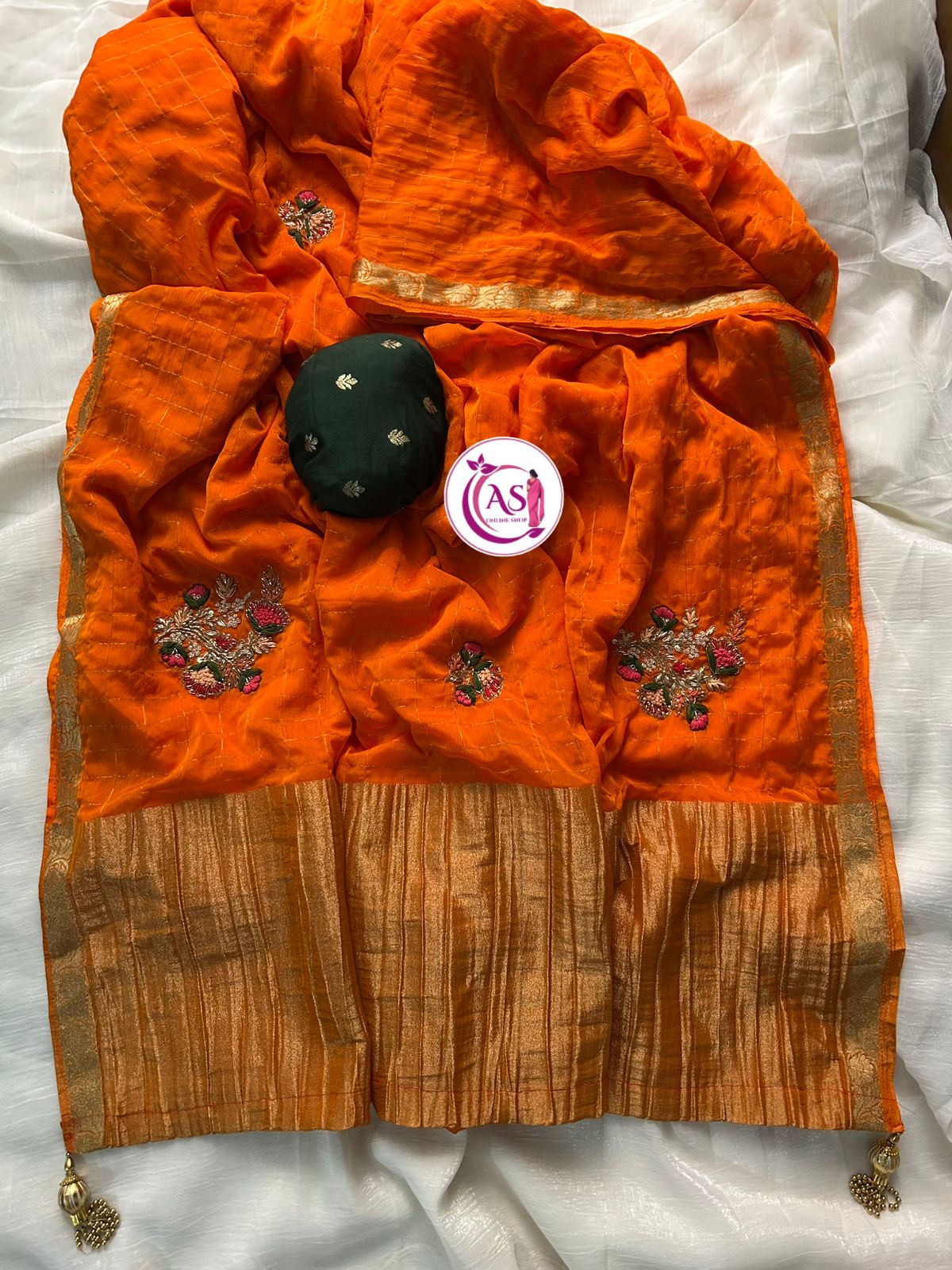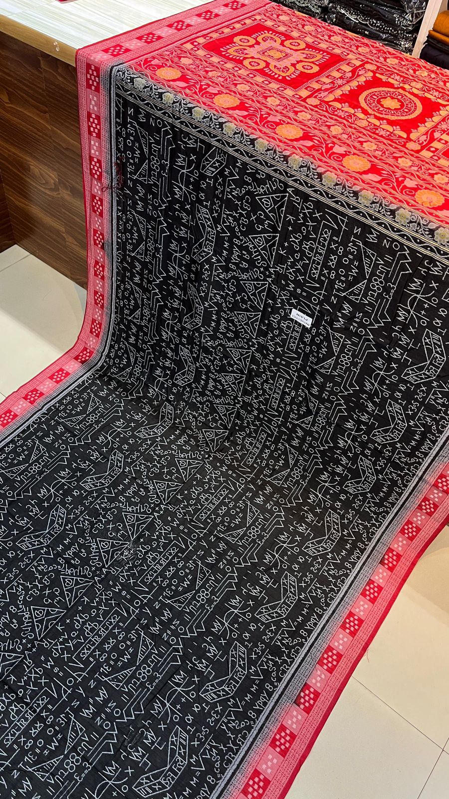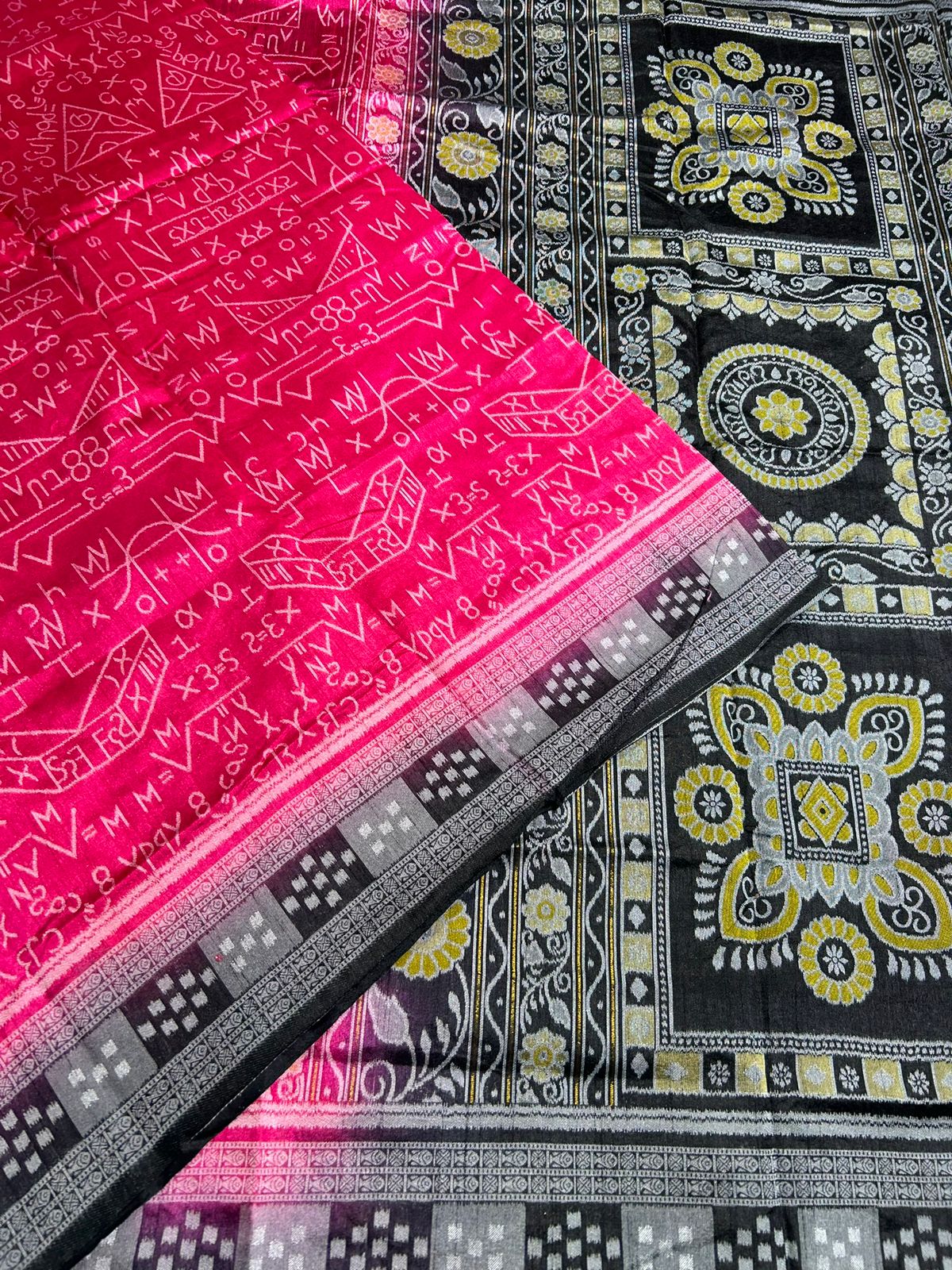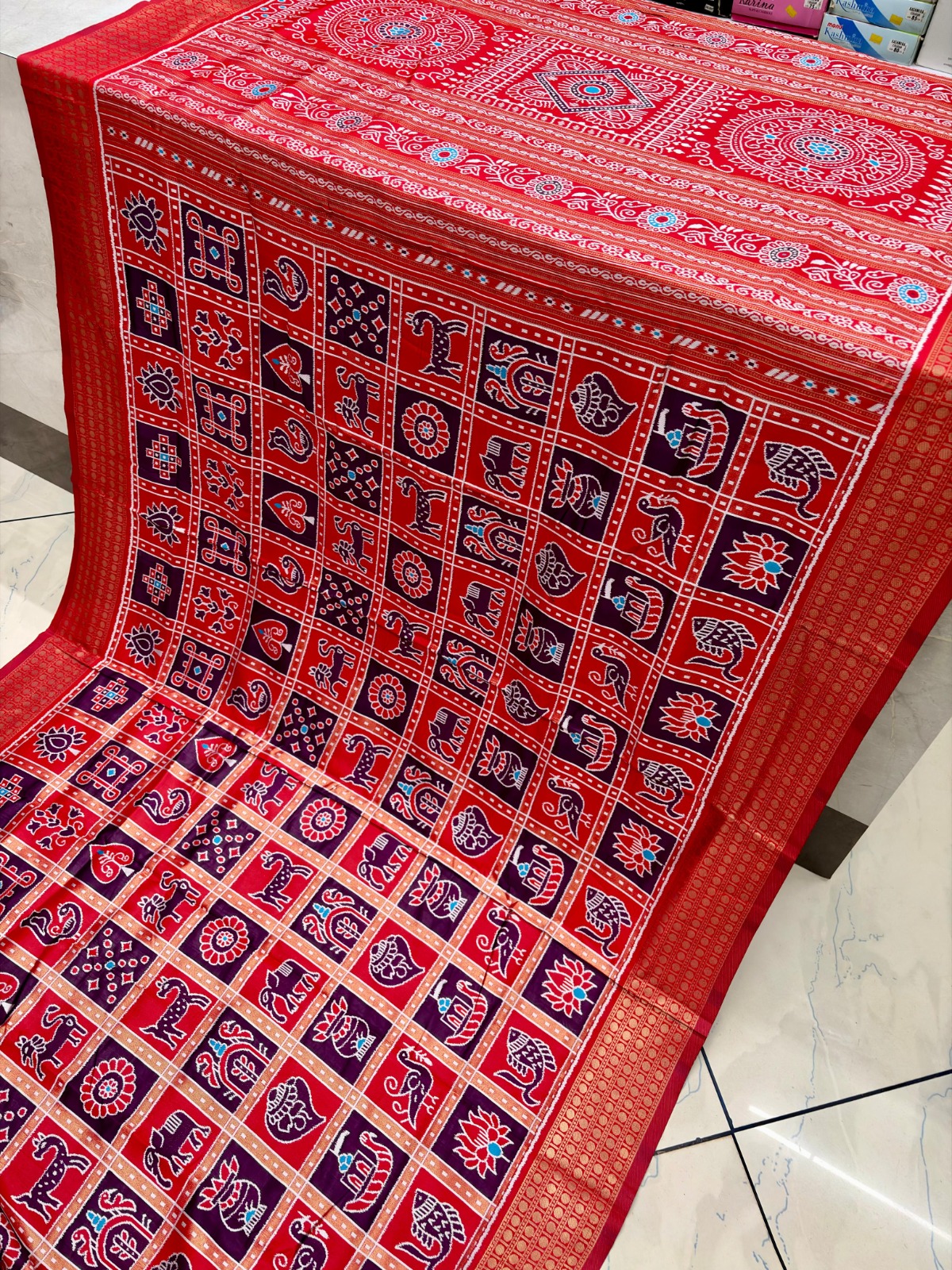 This beautiful saree is crafted from pure Mashru silk and features exquisite all-over peacock weaving that adds a regal and graceful touch. The saree is further enhanced with a necklace-designed woven border, giving it a statement look. A heavy pallu adorned with intricate multicolour thread work elevates its richness and elegance. It is paired with a plain blouse complemented by a classic zari border, perfectly balancing simplicity with tradition for a stunning overall appearance.