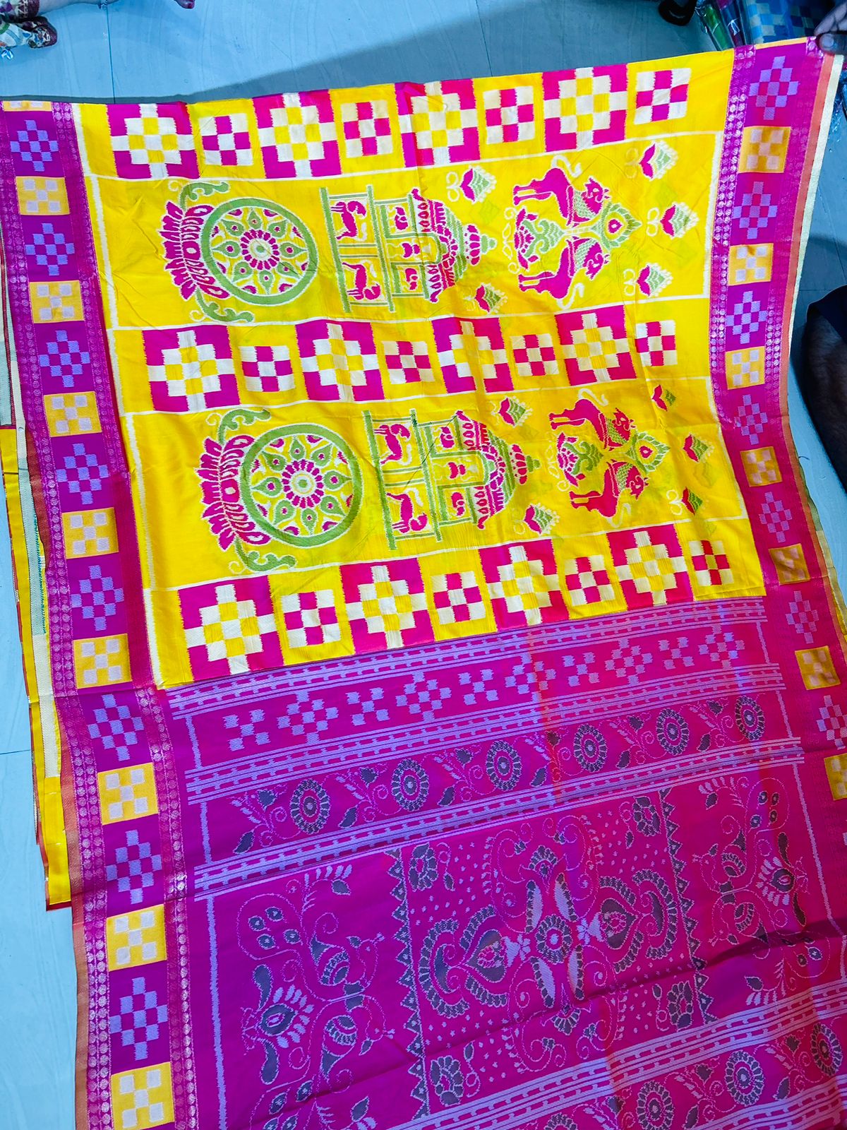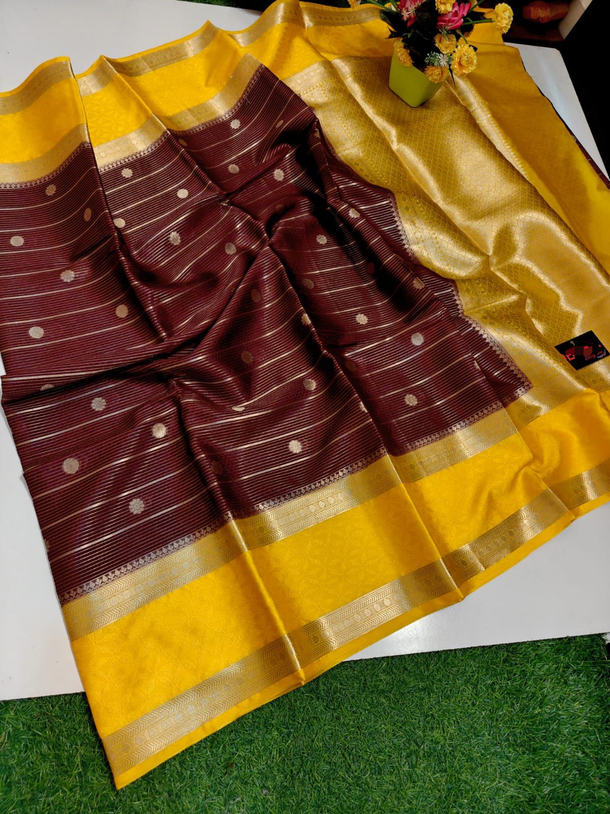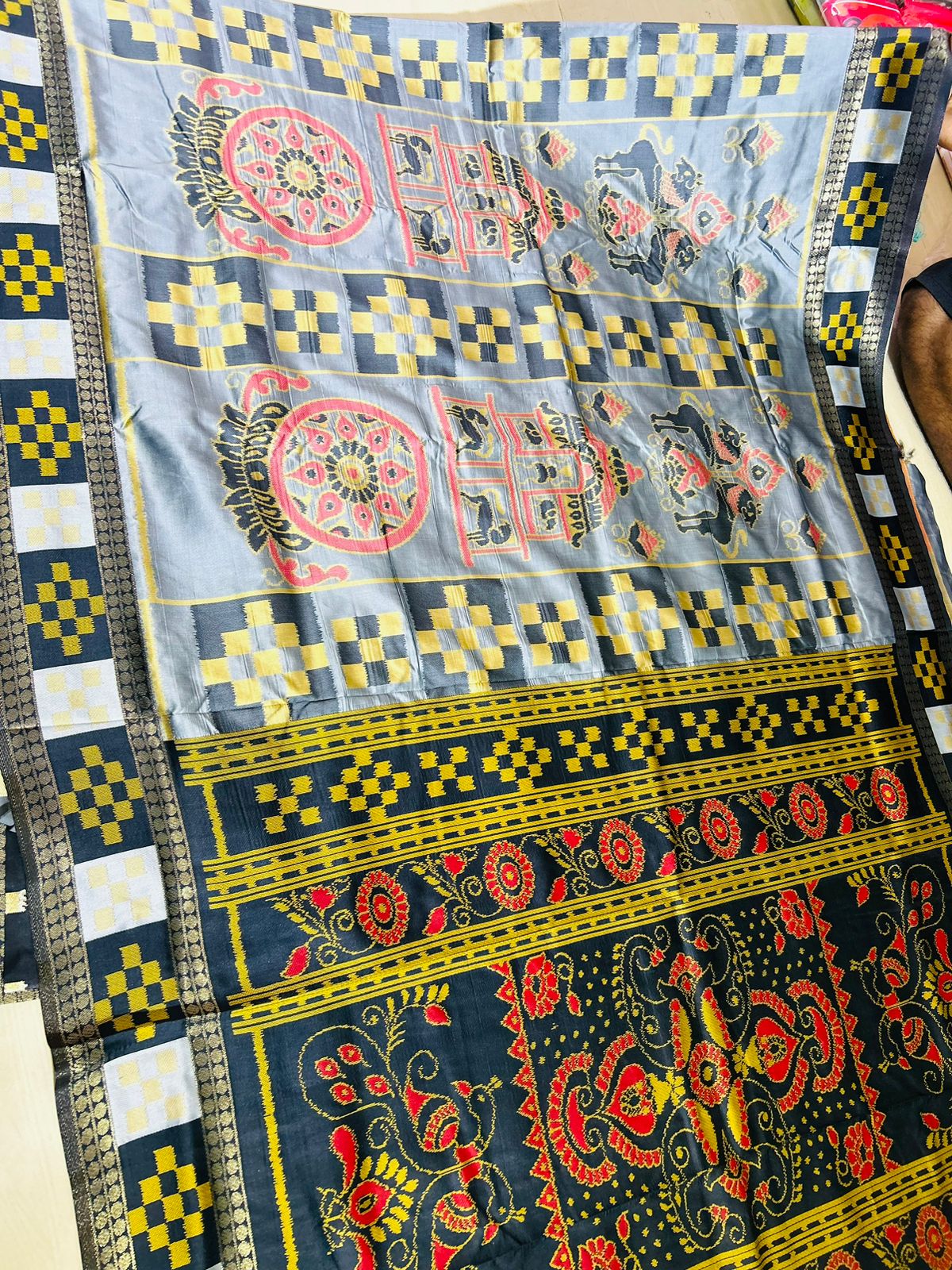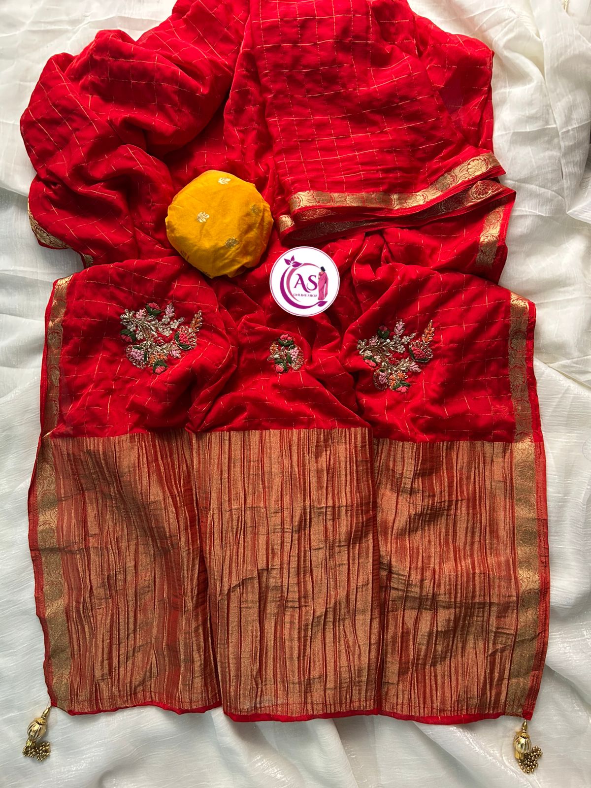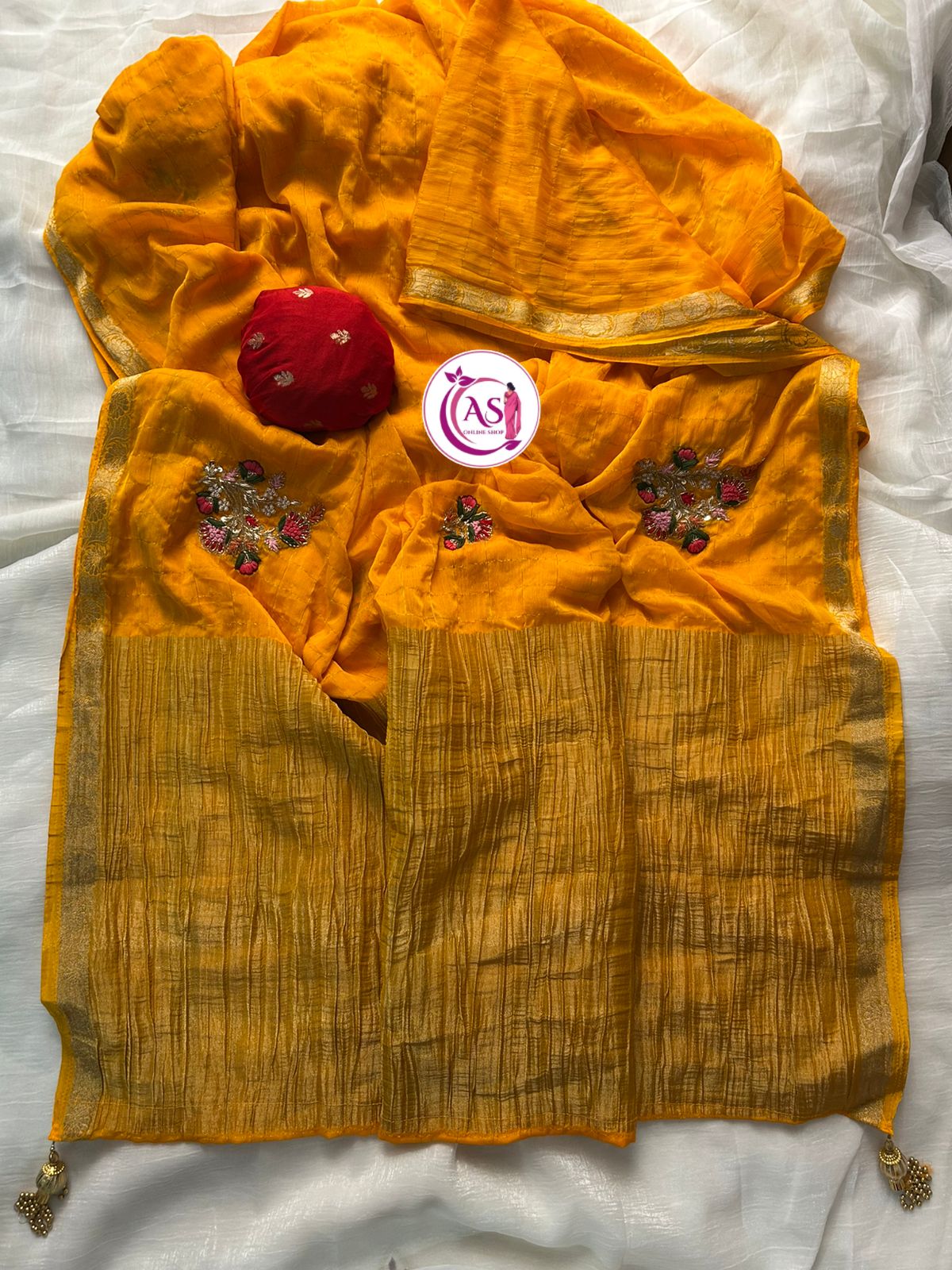This beautiful saree is crafted from pure Mashru silk and features exquisite all-over peacock weaving that adds a regal and graceful touch. The saree is further enhanced with a necklace-designed woven border, giving it a statement look. A heavy pallu adorned with intricate multicolour thread work elevates its richness and elegance. It is paired with a plain blouse complemented by a classic zari border, perfectly balancing simplicity with tradition for a stunning overall appearance.