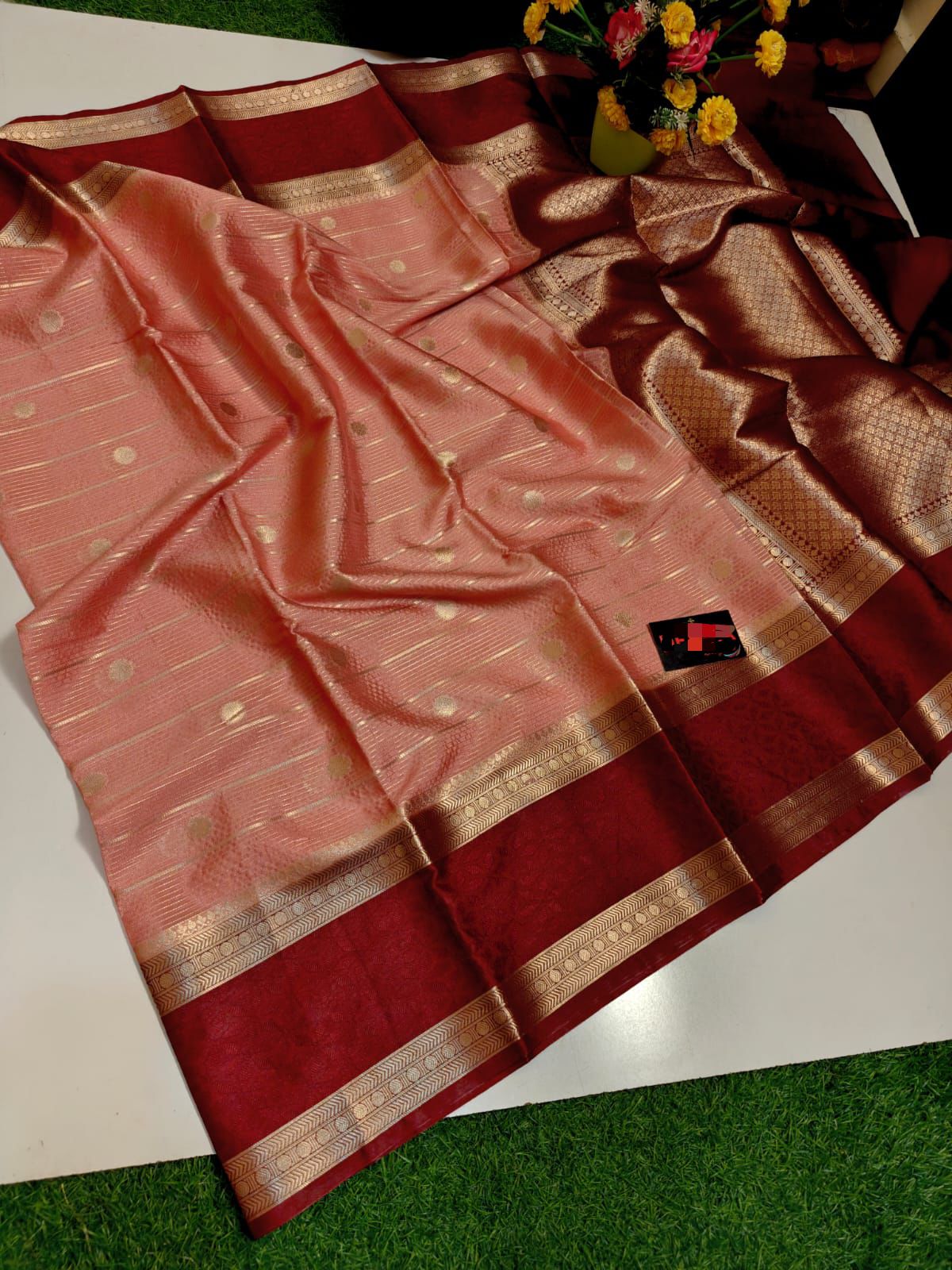 Coral Peach / Reddish Peach Pure Mashru Silk Saree